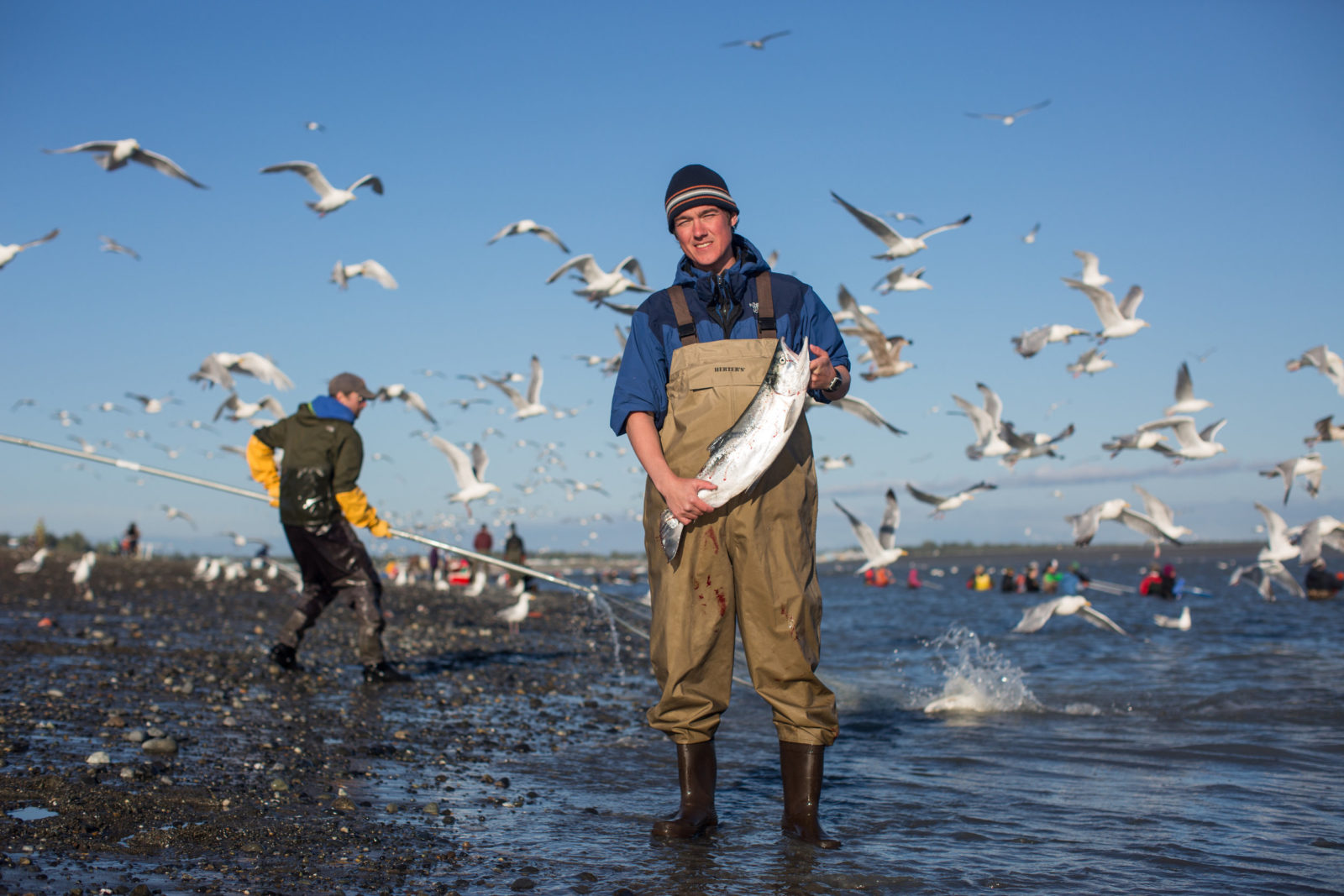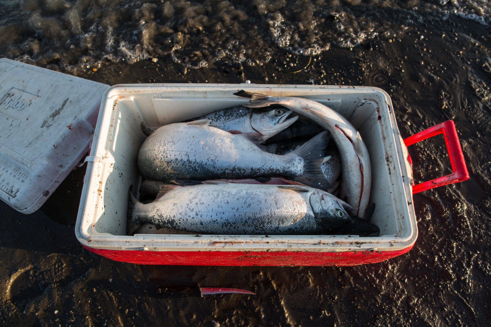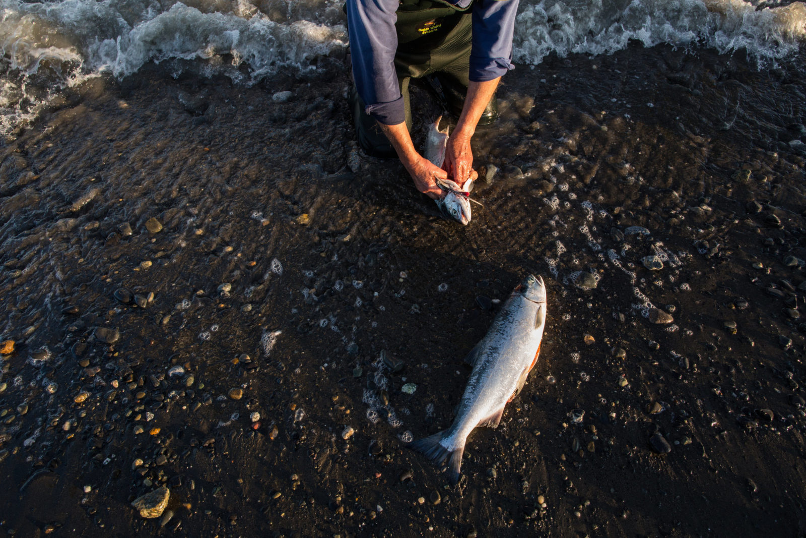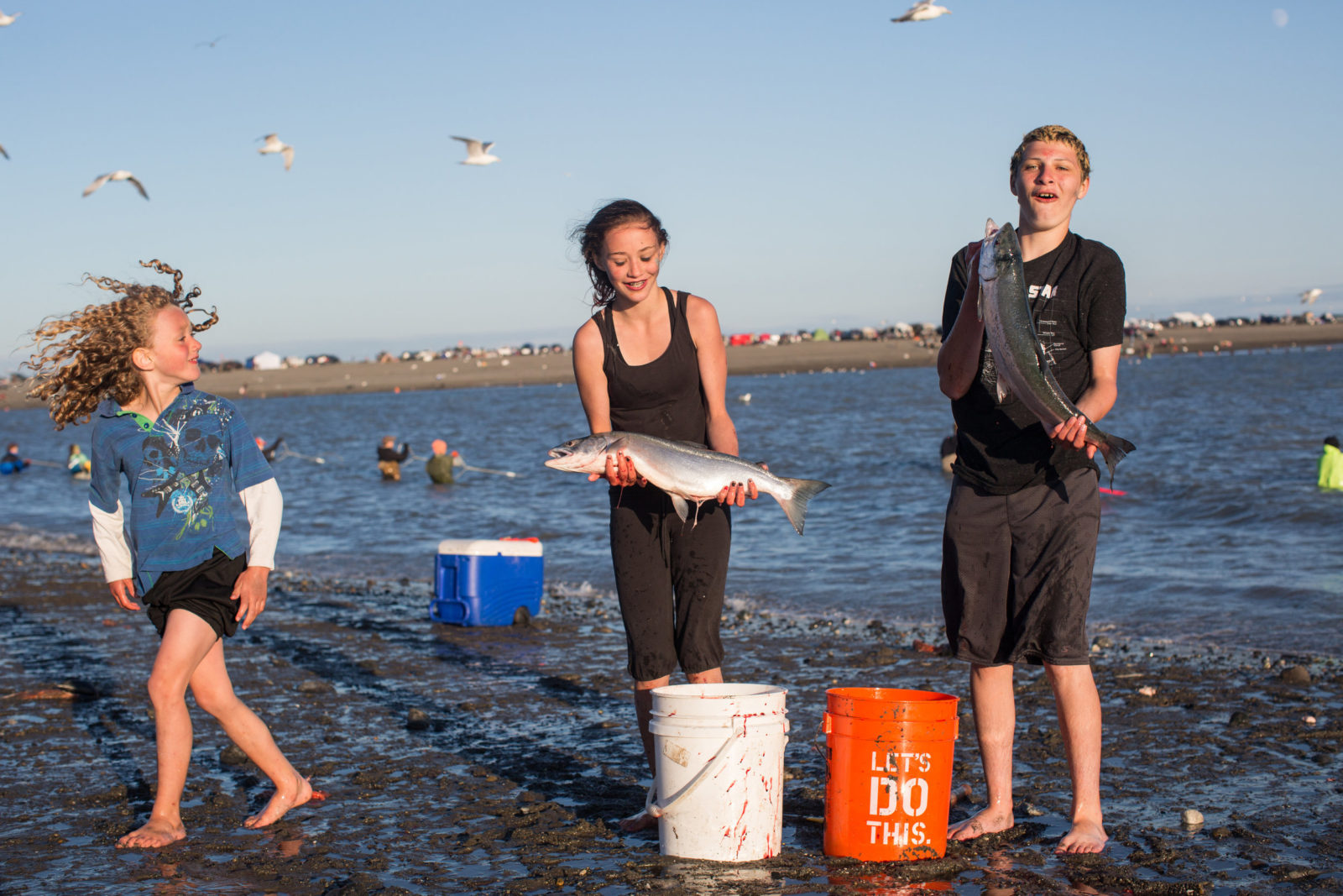 The day was slow with a warm sun beating down on families of beach-goers. Kids came back to shocked moms completely caked in the mud of a slough that runs behind the river. Dads and moms and grandmas and grandpas stood in a long line out in the surf where the waves of Cook Inlet slapped them in sets. One after another the white atop the waves frothed in the wind, running over chest waders and down into boots.