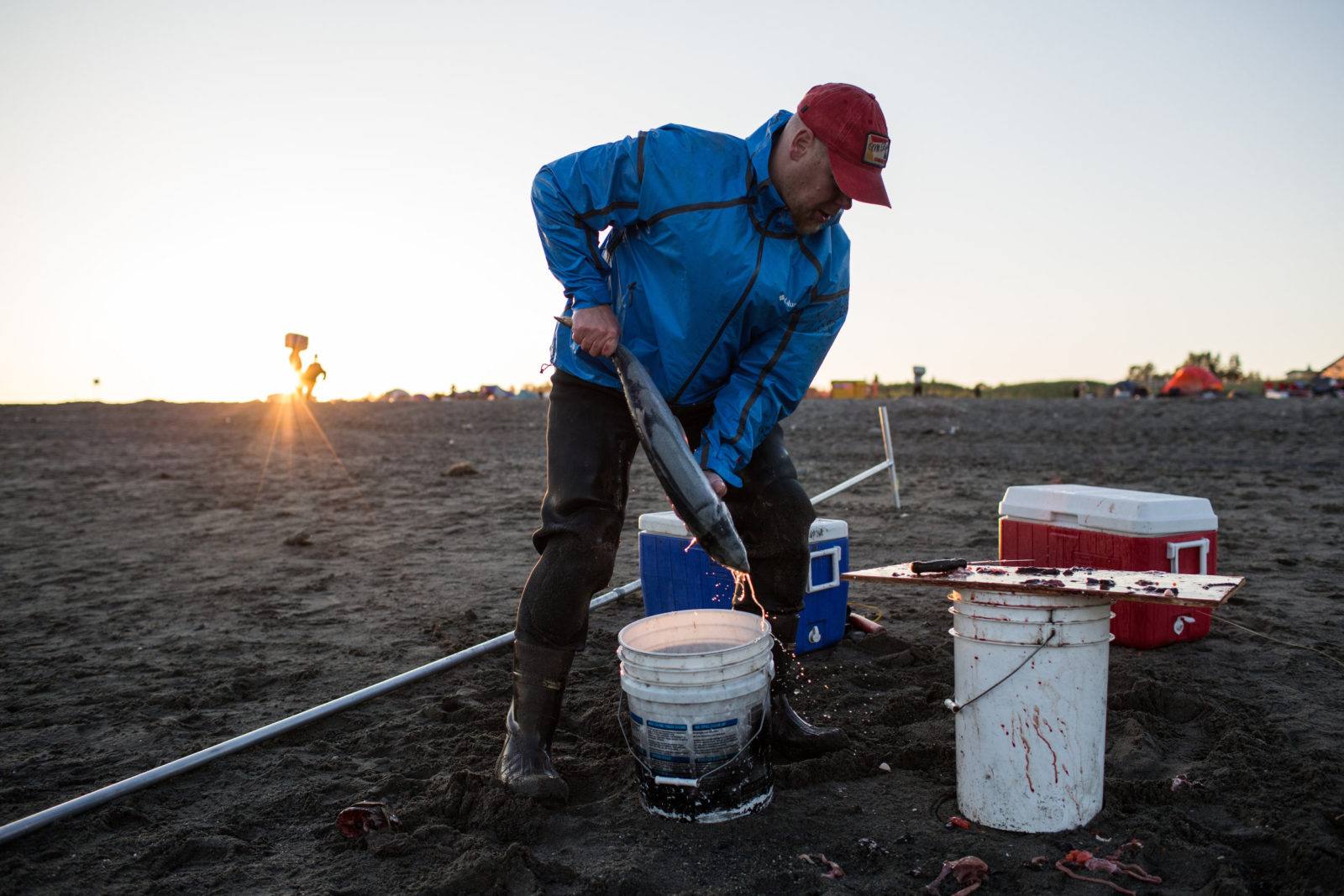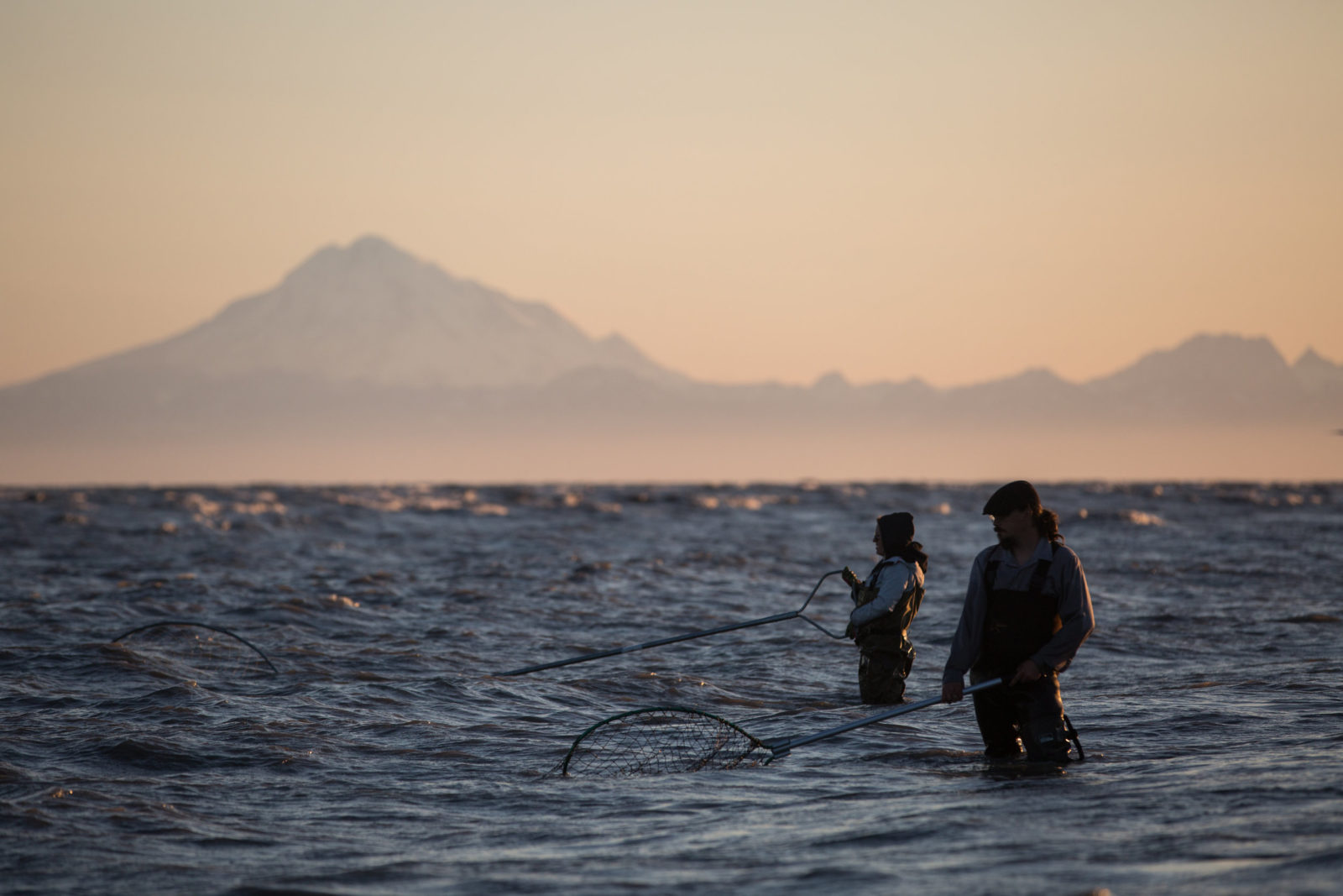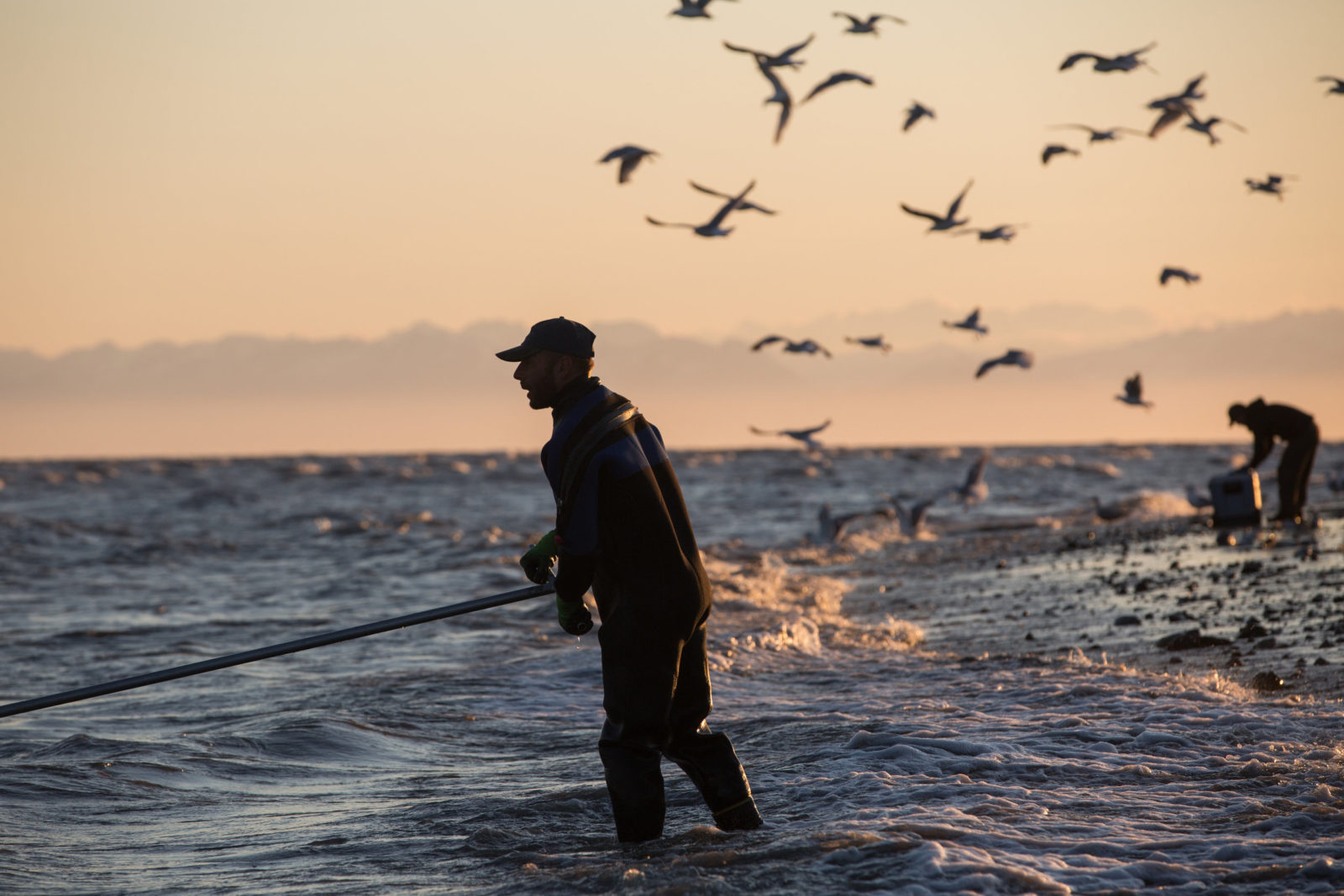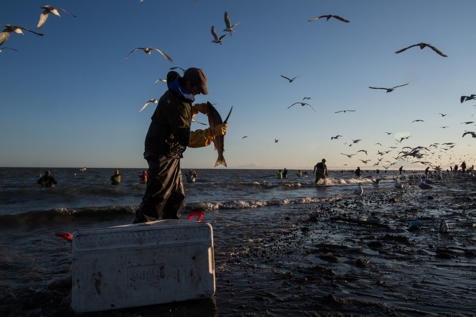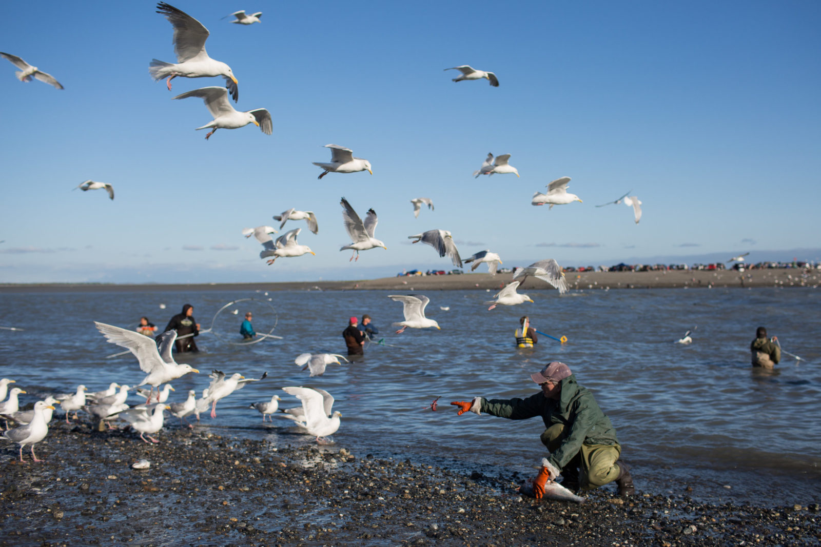 The day was slow with a warm sun beating down on families of beach-goers. Kids came back to shocked moms completely caked in the mud of a slough that runs behind the river. Dads and moms and grandmas and grandpas stood in a long line out in the surf where the waves of Cook Inlet slapped them in sets. One after another the white atop the waves frothed in the wind, running over chest waders and down into boots.