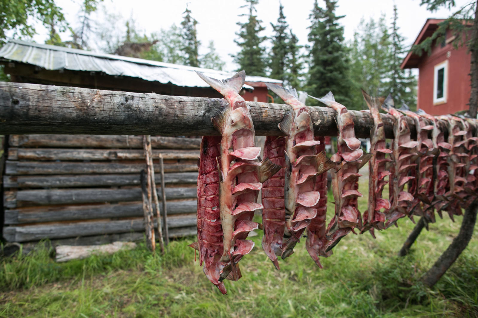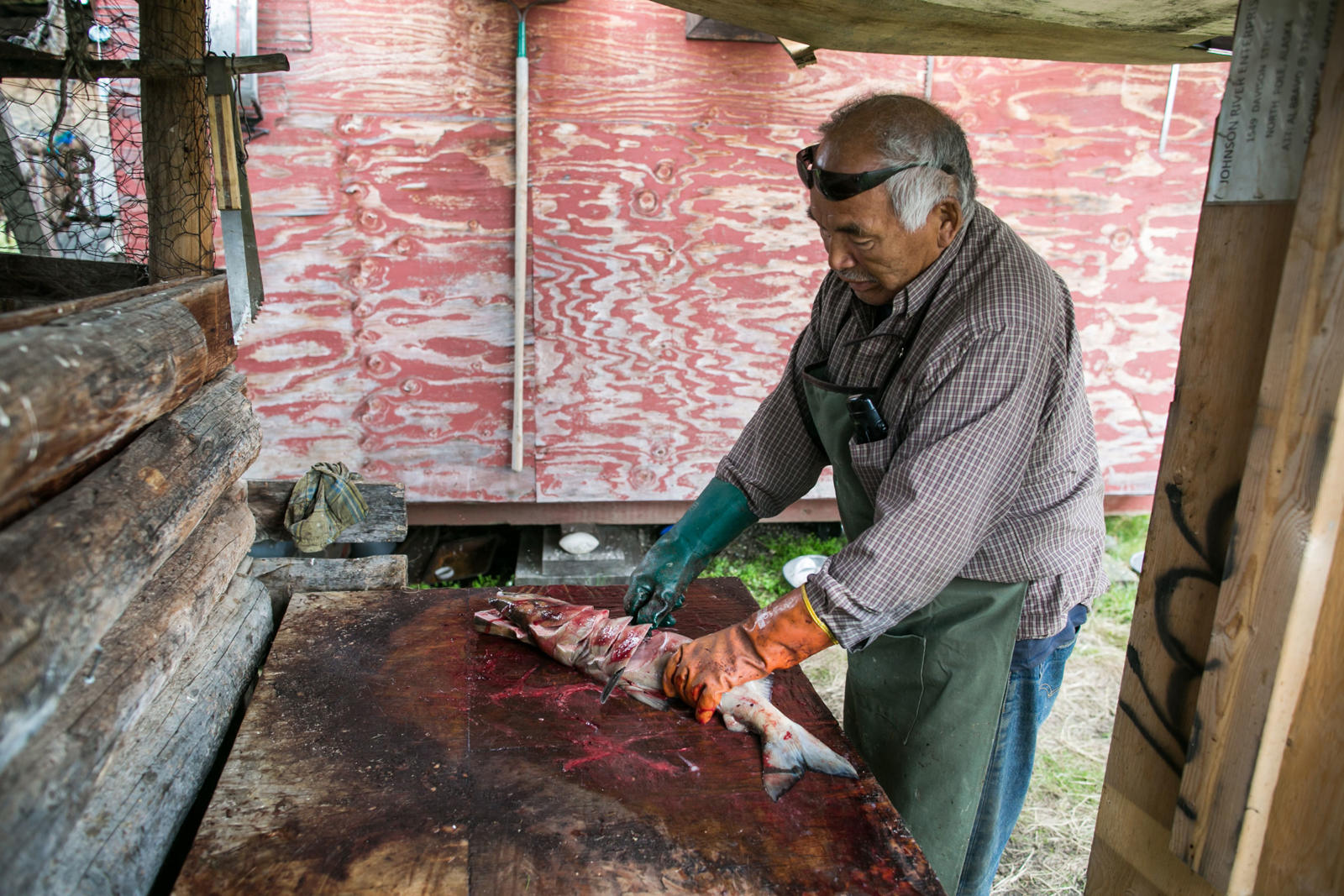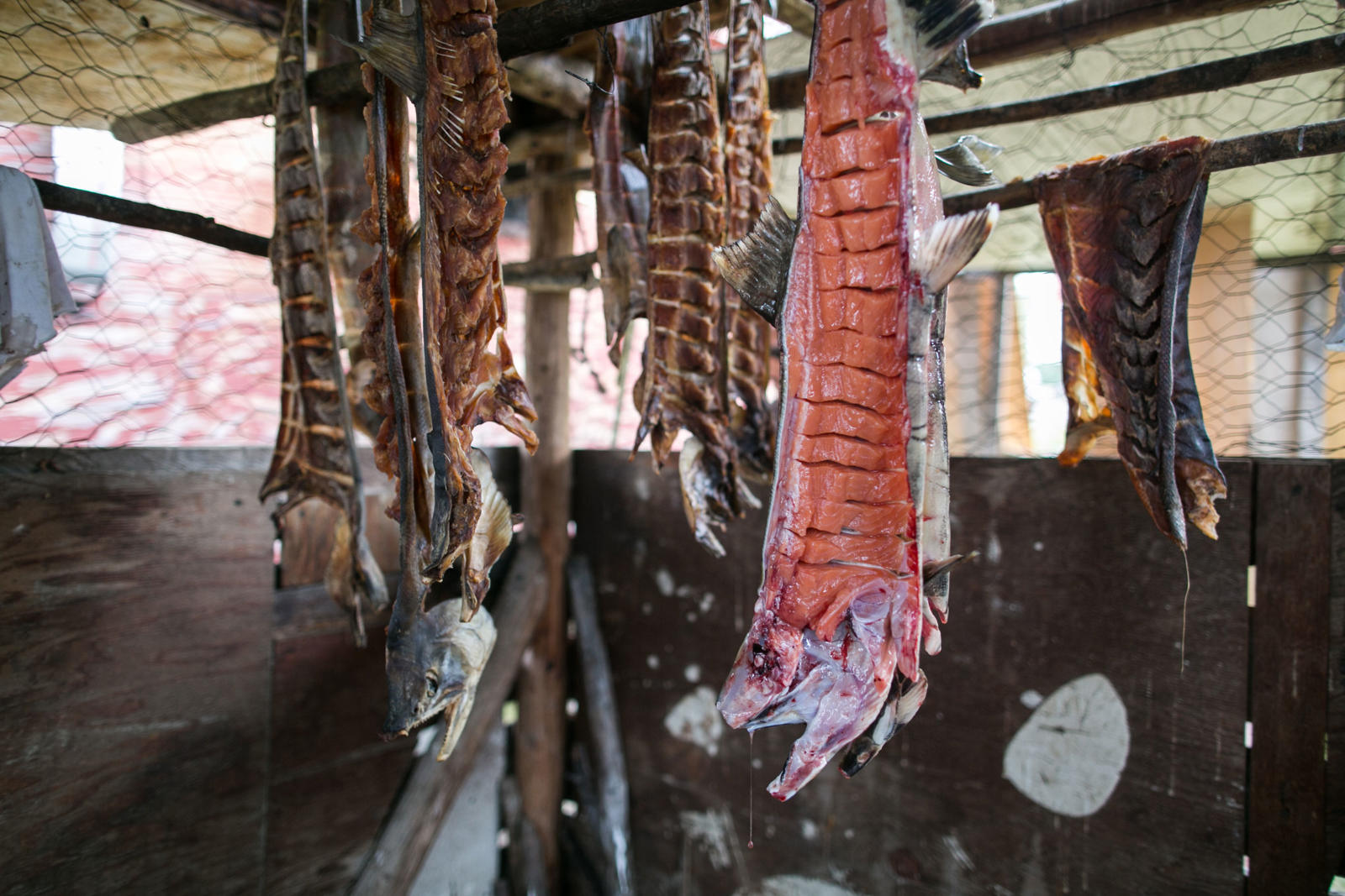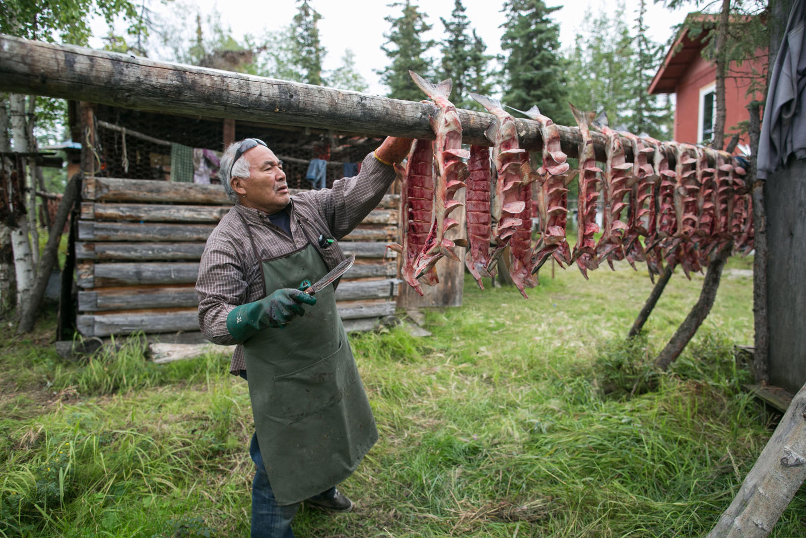 Steve Bergman is not only providing for his large extended family by fishing for salmon, he’s also feeding his dog team. He estimates he needs to catch about 2,000 chum salmon to feed his 17 dogs. Being nutrient rich, salmon provide a much needed resource for an active dog team. Chum salmon for dogs is cut in a way that preserves as much of the salmon as possible. For instance, the salmon is cut from the tail all the way through the head and dried.