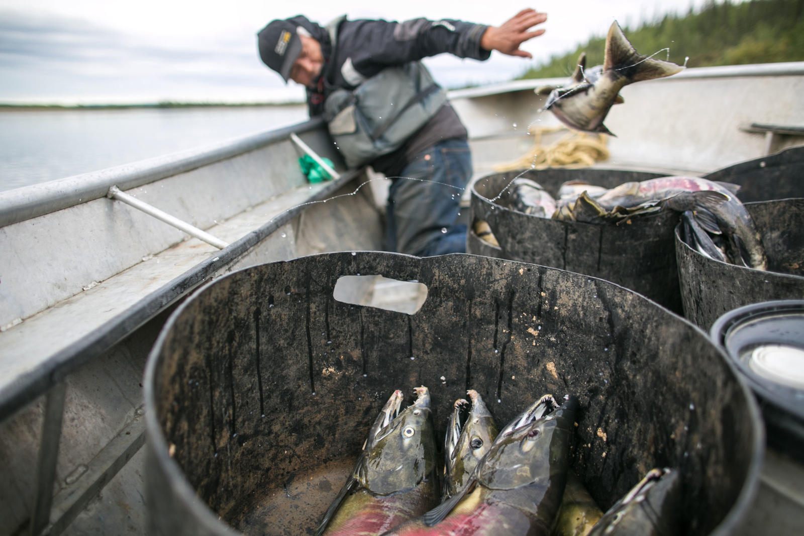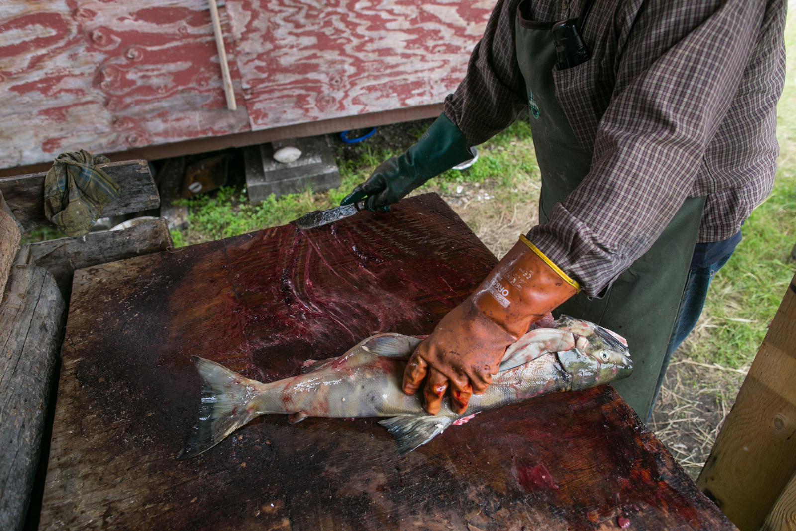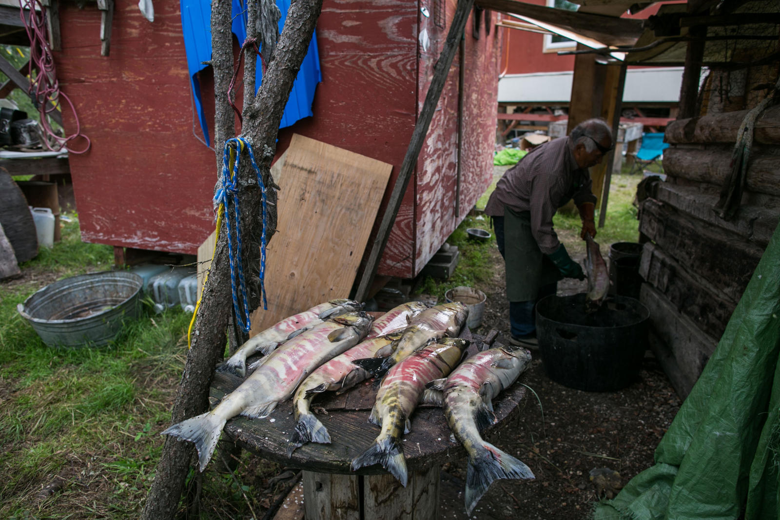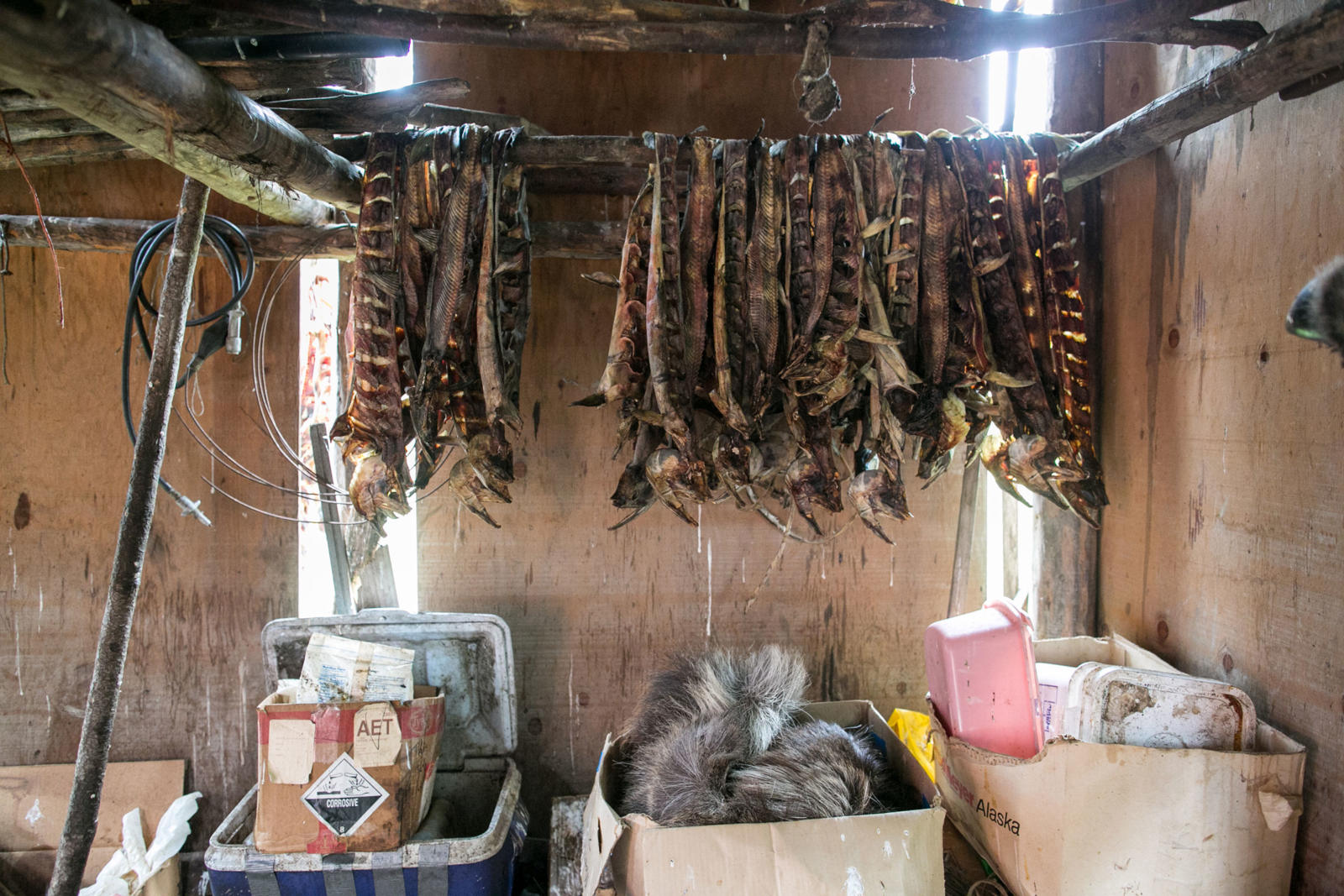 Steve Bergman is not only providing for his large extended family by fishing for salmon, he’s also feeding his dog team. He estimates he needs to catch about 2,000 chum salmon to feed his 17 dogs. Being nutrient rich, salmon provide a much needed resource for an active dog team. Chum salmon for dogs is cut in a way that preserves as much of the salmon as possible. For instance, the salmon is cut from the tail all the way through the head and dried.