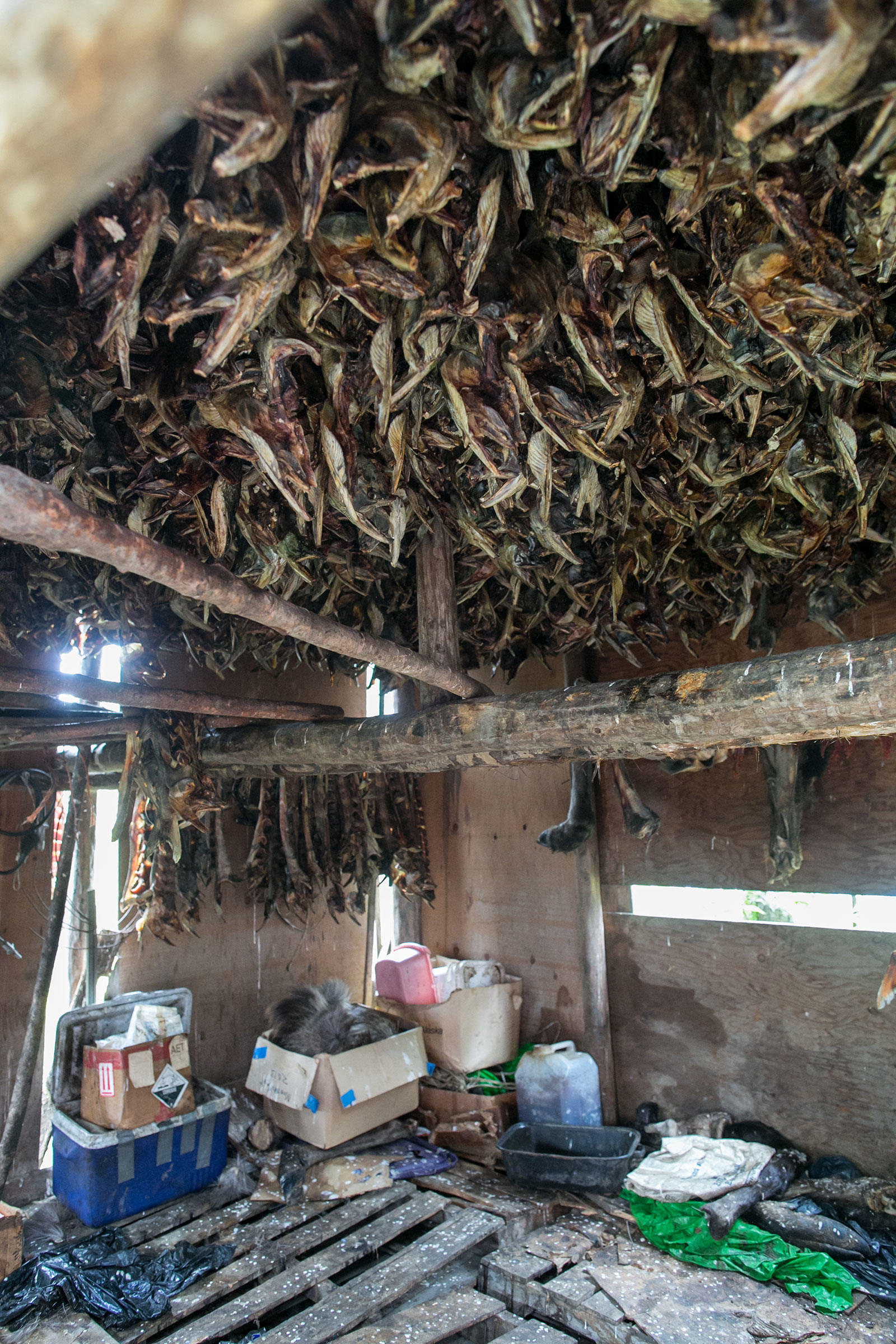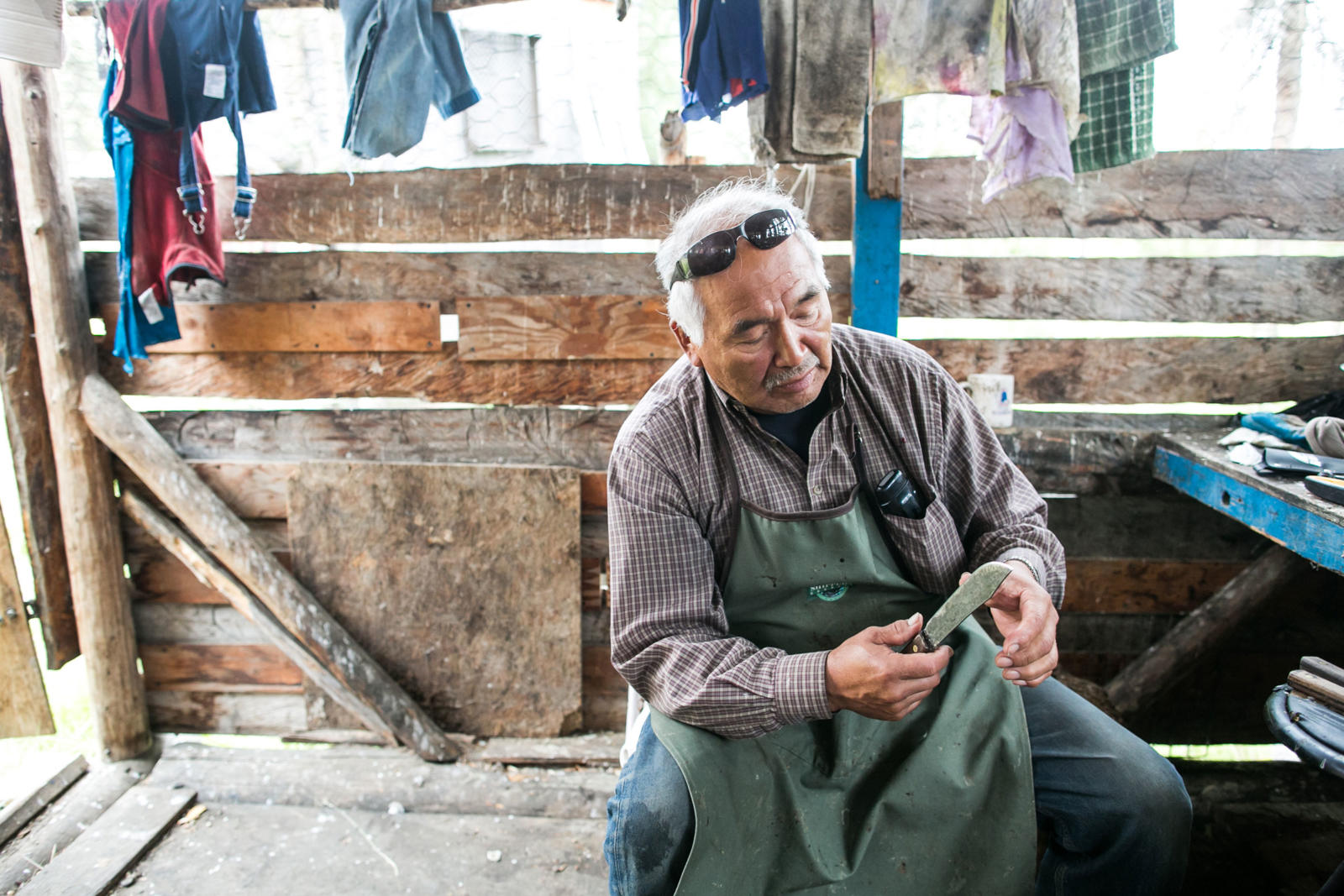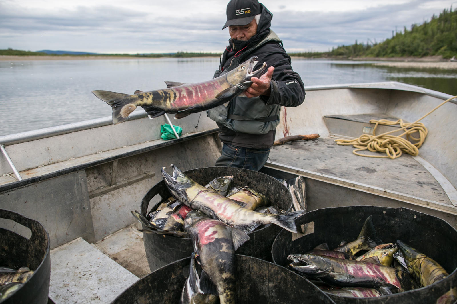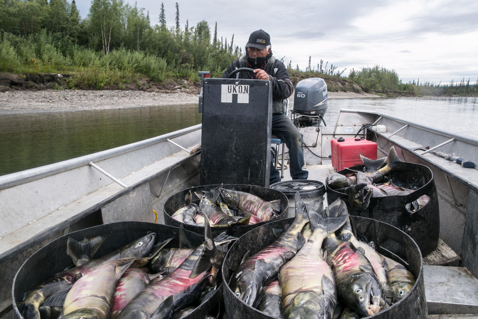 Steve Bergman is not only providing for his large extended family by fishing for salmon, he’s also feeding his dog team. He estimates he needs to catch about 2,000 chum salmon to feed his 17 dogs. Being nutrient rich, salmon provide a much needed resource for an active dog team. Chum salmon for dogs is cut in a way that preserves as much of the salmon as possible. For instance, the salmon is cut from the tail all the way through the head and dried.