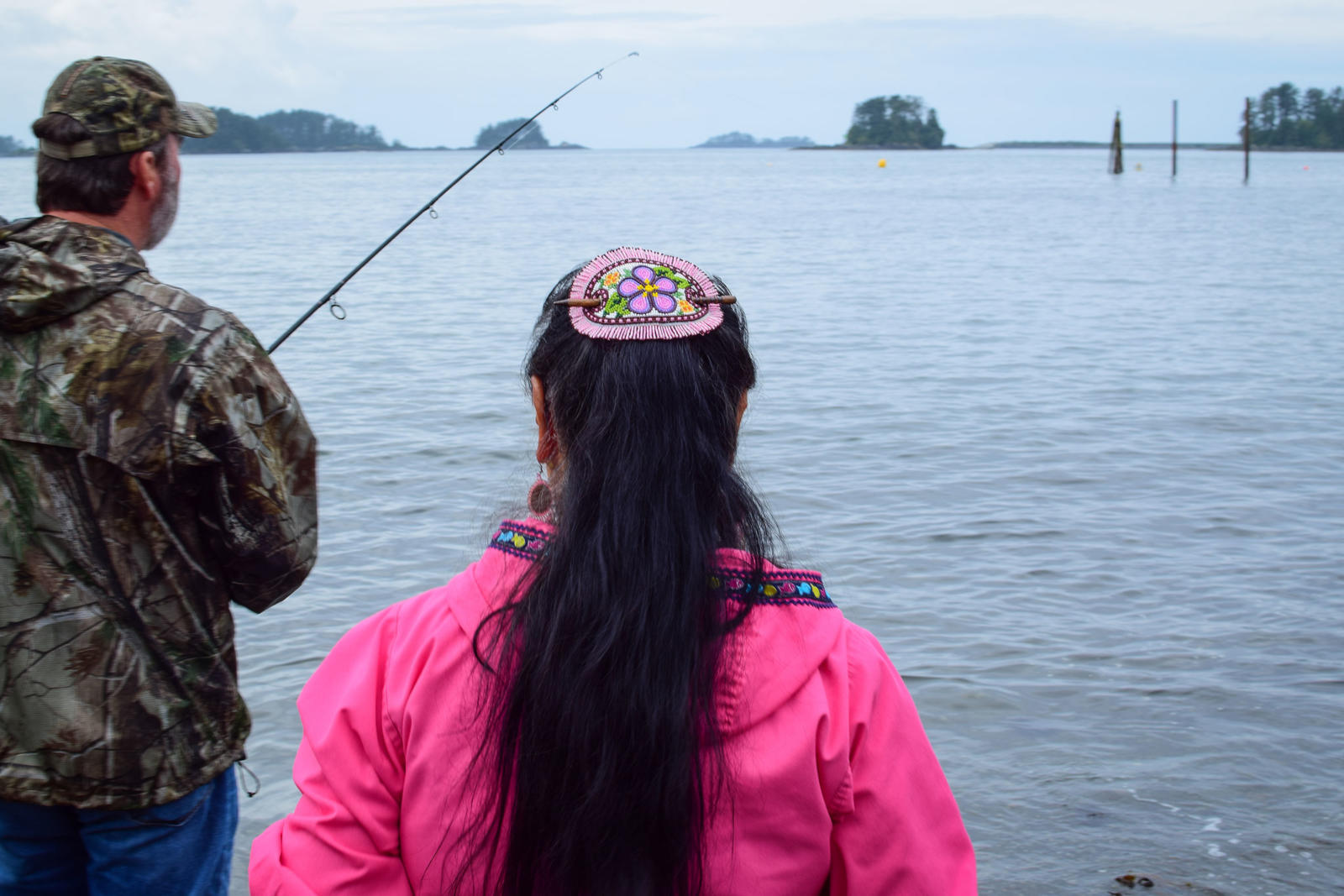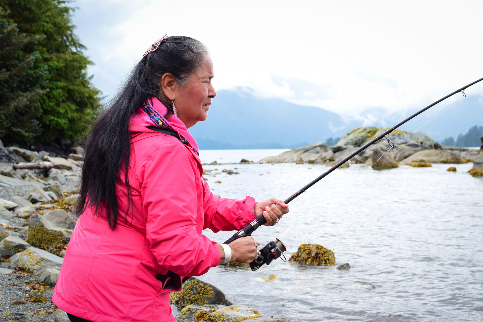 Her husband has been pulling salmon ashore to eat and so that Audrey can share skins with her students for future projects. “If you ask any Native person for their fish skin, they don’t give it out because they smoke it with the skin on because all of the richness is in the skin. So none of my Native people want to give me skins,” she laughs. “We have to get our own!” She takes over the rod and gets to work. Reeling fast and diligently, she giggles and smiles.