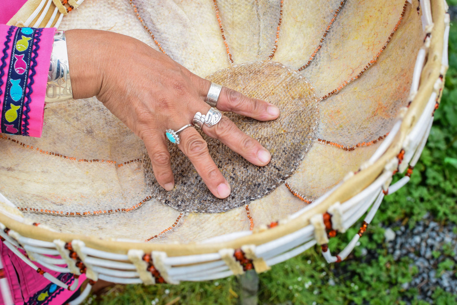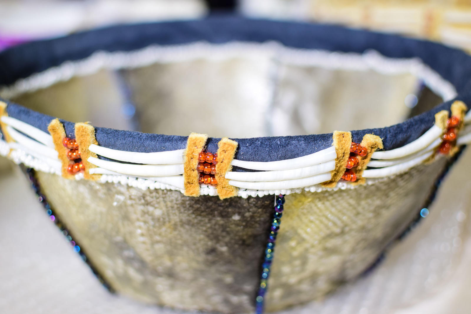 “Let me show you something!” beckons Audrey. She displays a large open basket with a proud smile. “This is my Chief’s basket.” The basket is trimmed with moose skin, shells and small orange beads to symbolize salmon roe.