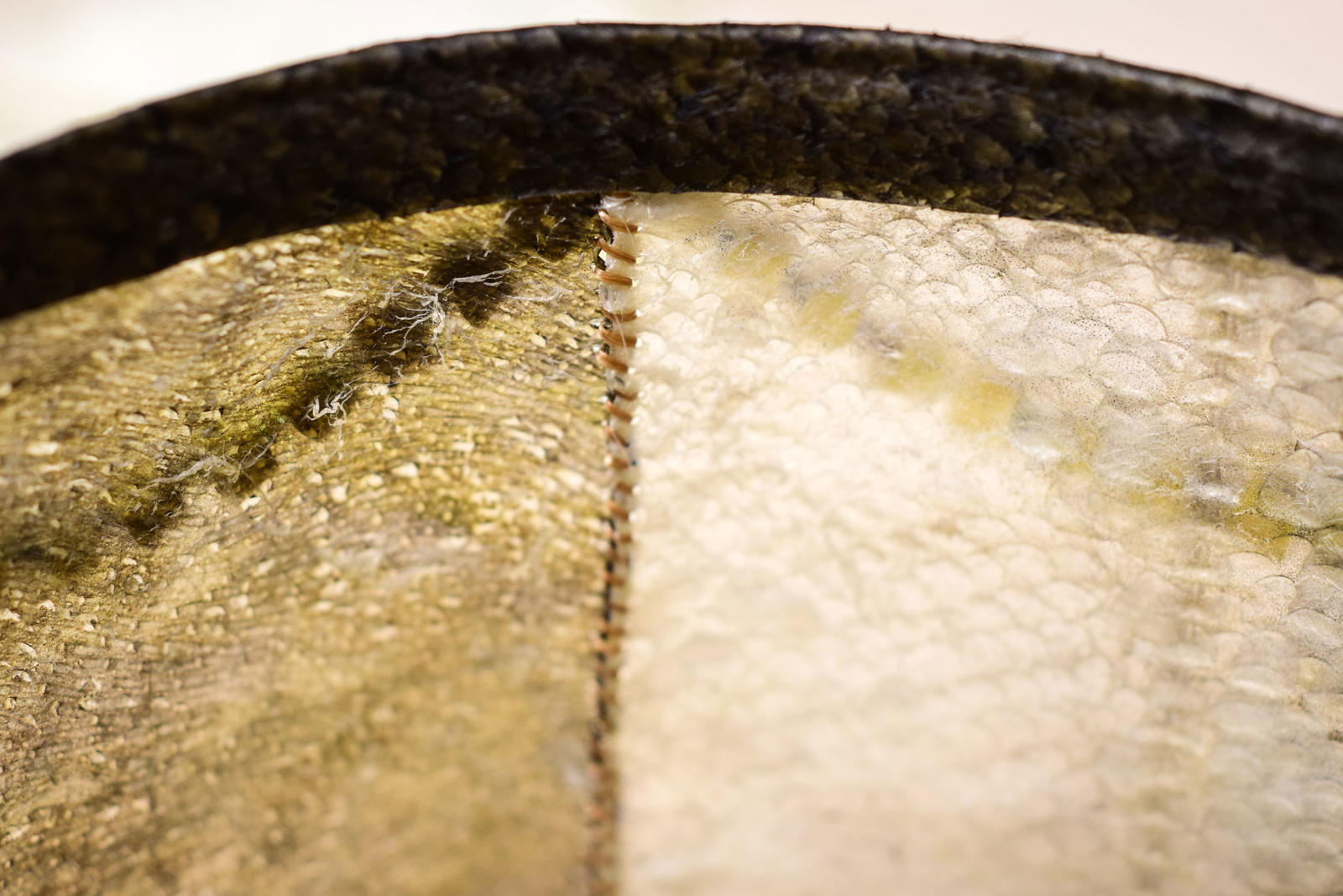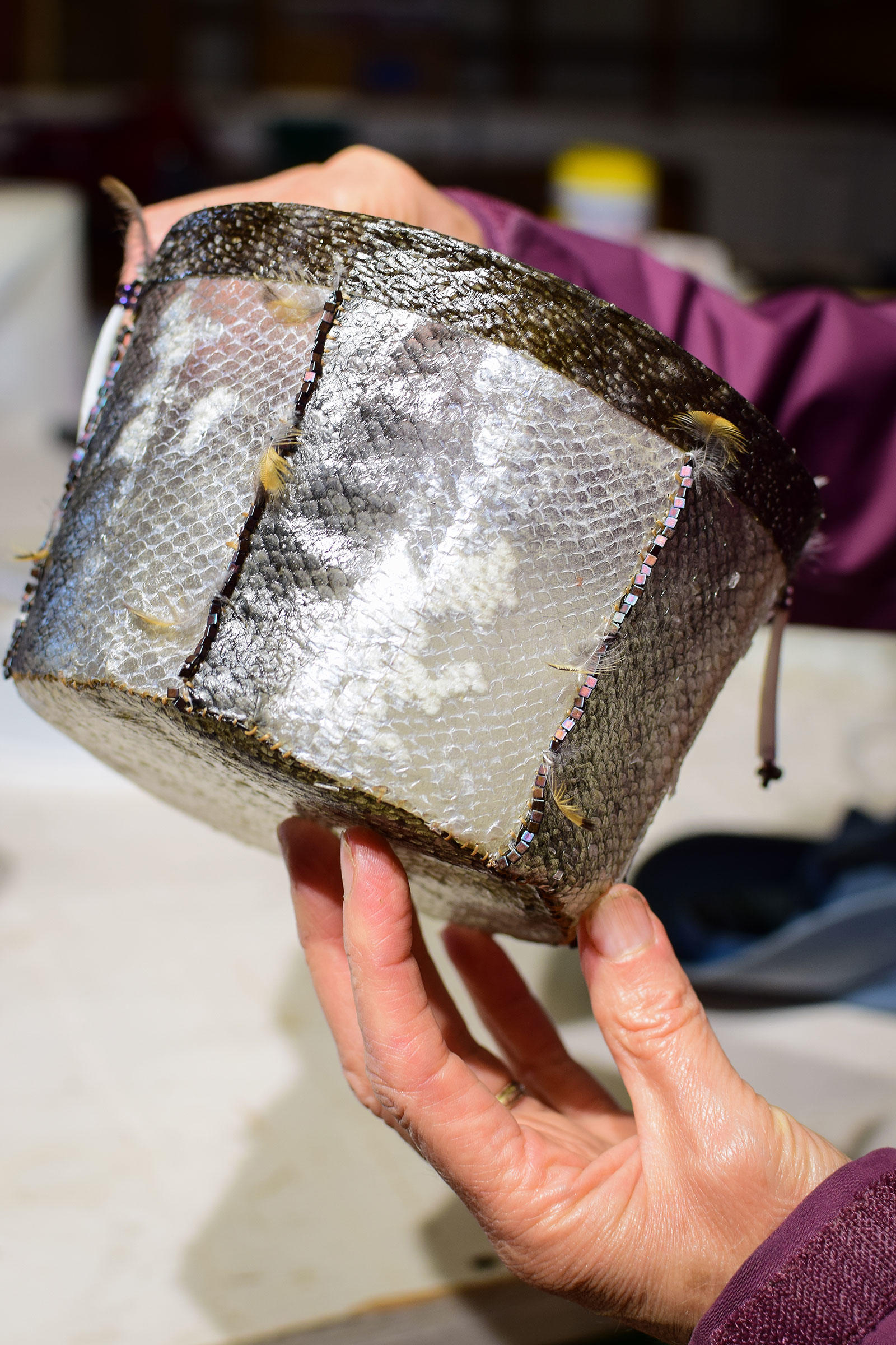 As Audrey tells it, almost any Alaskan fish skin can be used for this craft, but she favors salmon. Salmon is the fish that sustains her family and culture, and it was a silver salmon that inspired her, 15 years ago, to learn this utilitarian art form.