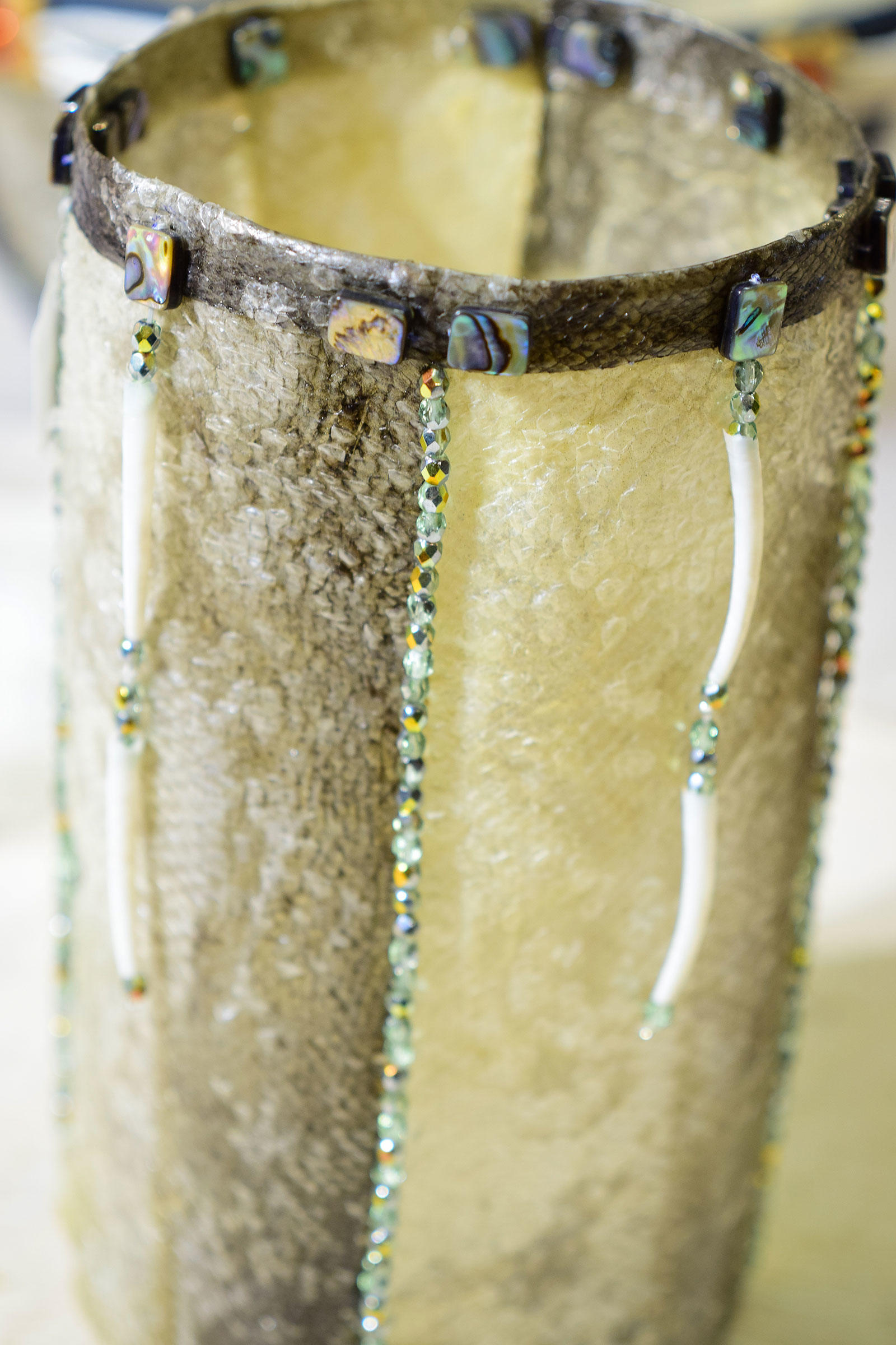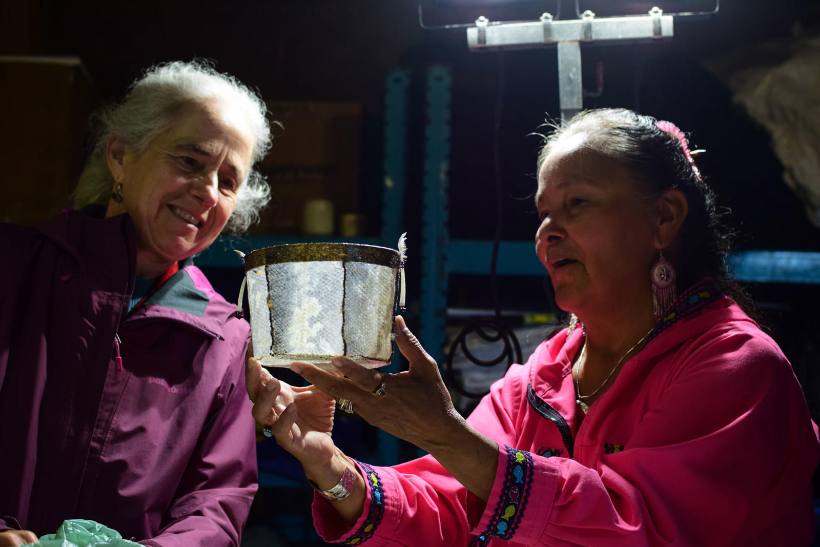 “In that same year, Fran died and we promised her before she died, that the following year after the class that all 13 of us would have an exhibit in her honor. We would show all different kinds of fish skin works: masks, capes, necklaces. And, we did. I made a big berry bucket,” recalls Audrey.
