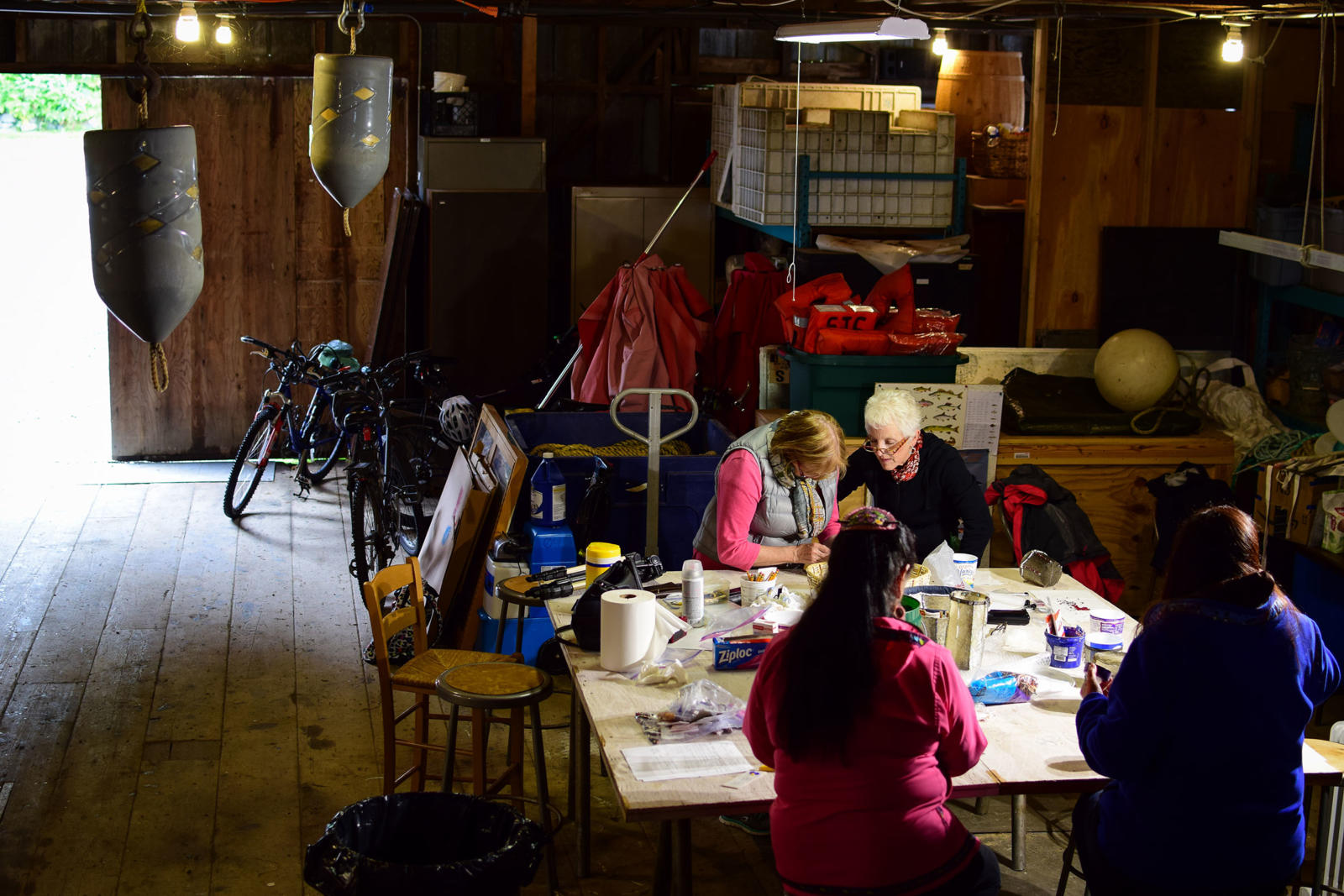 In a large, old, wooden building on the waterfront at Sitka Sound Science Center, a group of women gathers around a central table. A spotlight leans over their shoulders, lending light to a delicate creative process. Dressed in bright pink, Audrey Armstrong strains her eyes and carefully aligns mind, material and dexterity as she pierces a tiny needle through glittering scales.