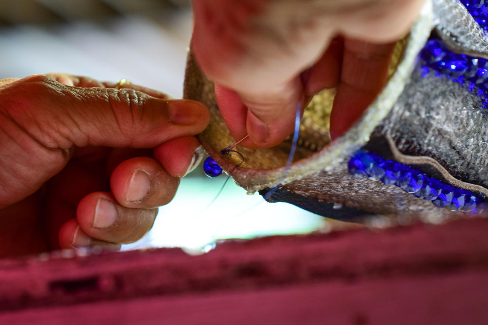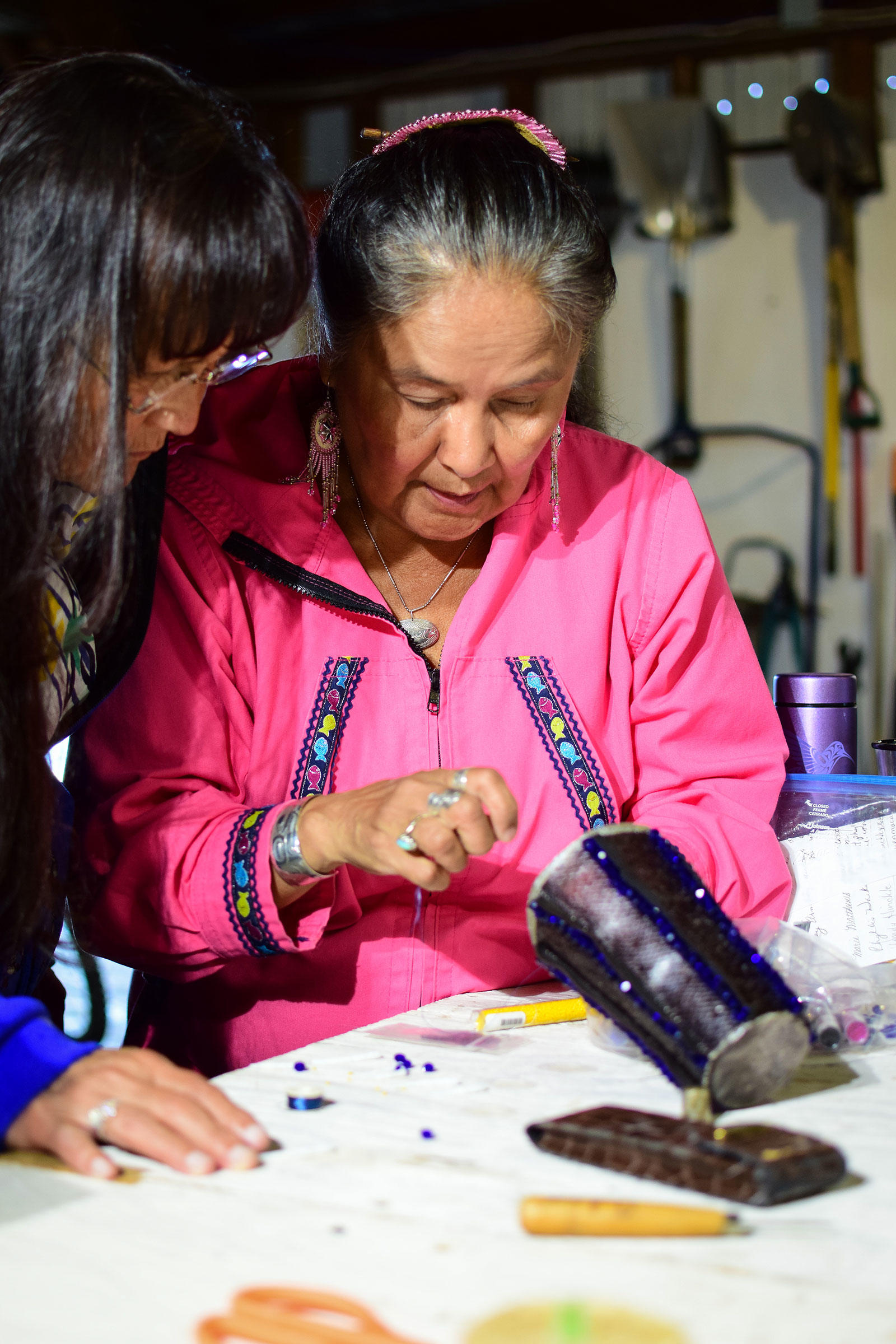 “When she was teaching us she was very ill, so we would set up a big chair for her and we called it ‘the queens chair’. She would sit and talk to us and we would bring things up to her and she would tell us what to do next. Kind of like what I’m doing right now in this class,” laughs Armstrong as she turns to offer advice and to tie beads onto one of her student’s pieces.