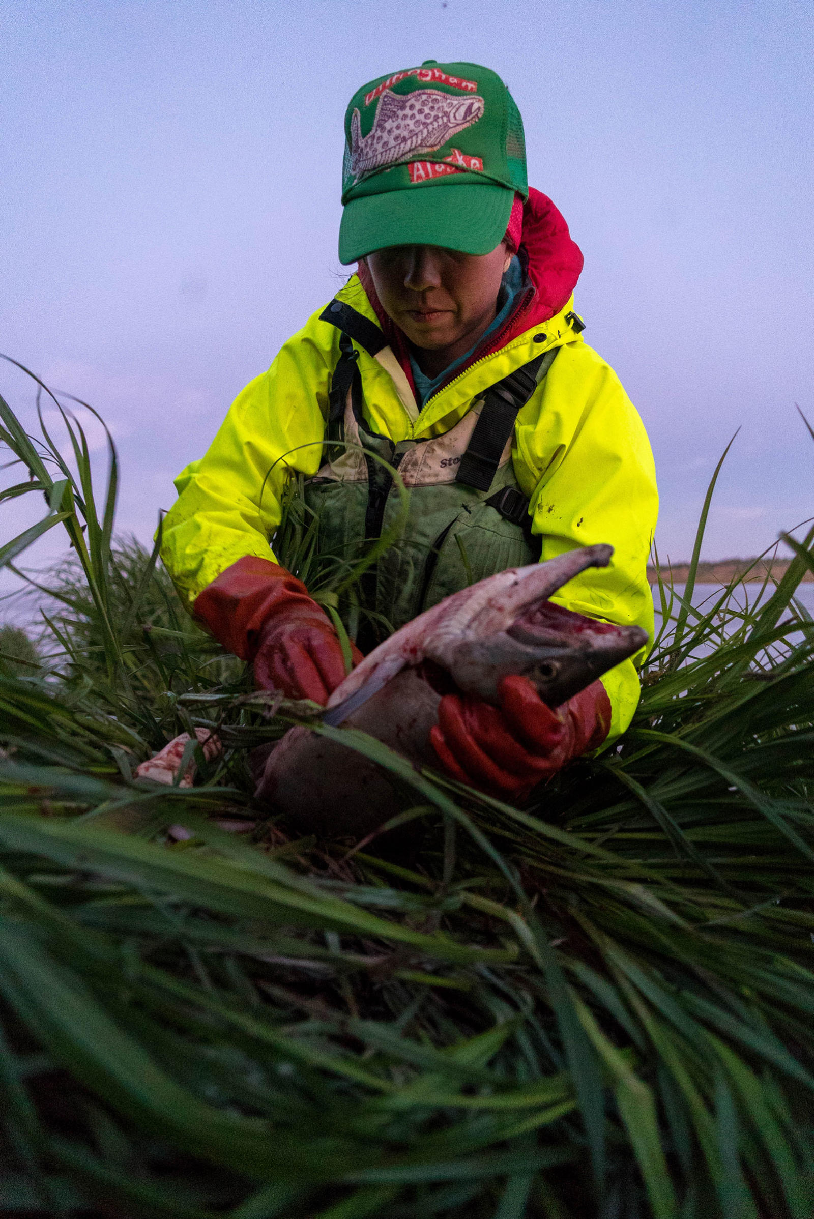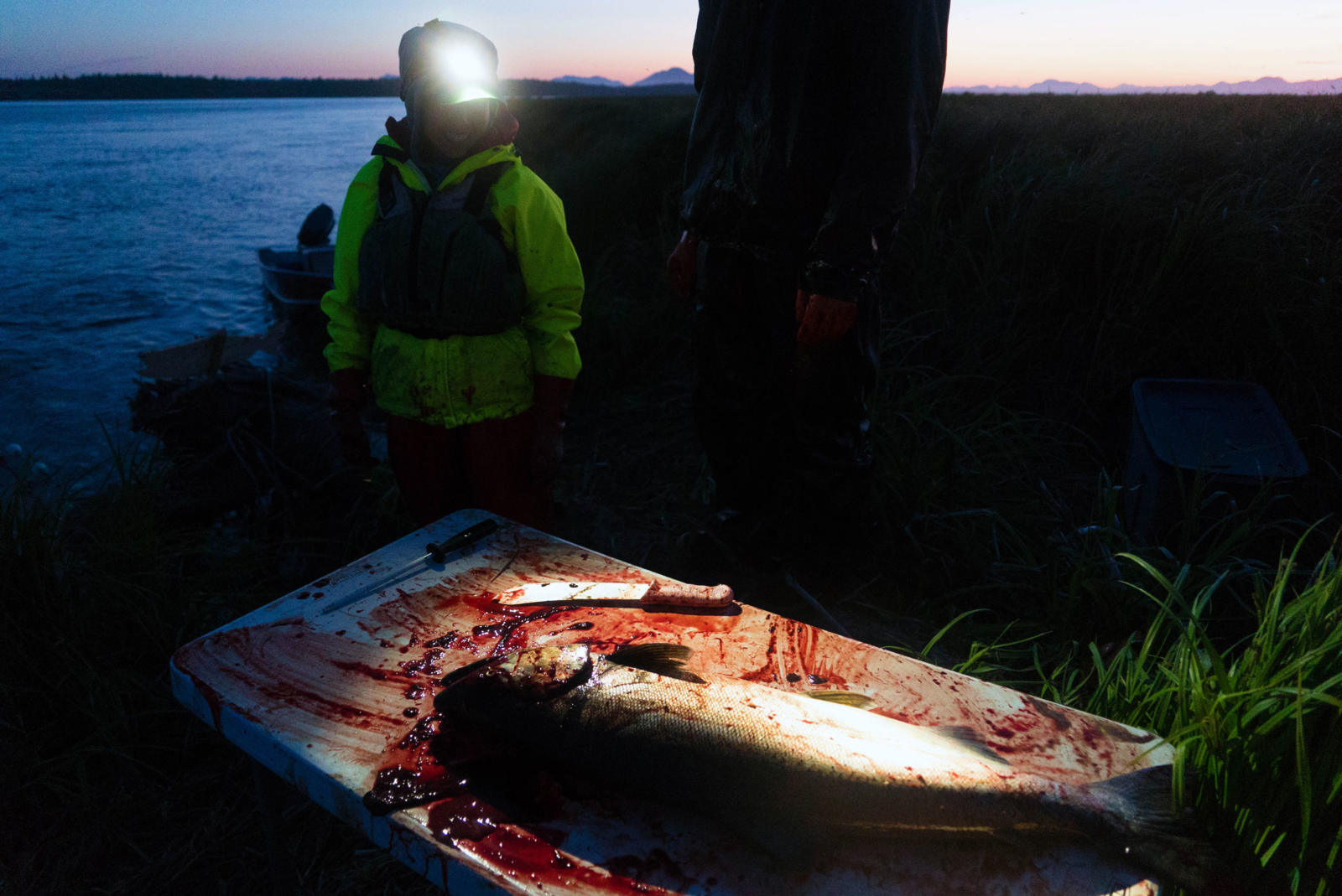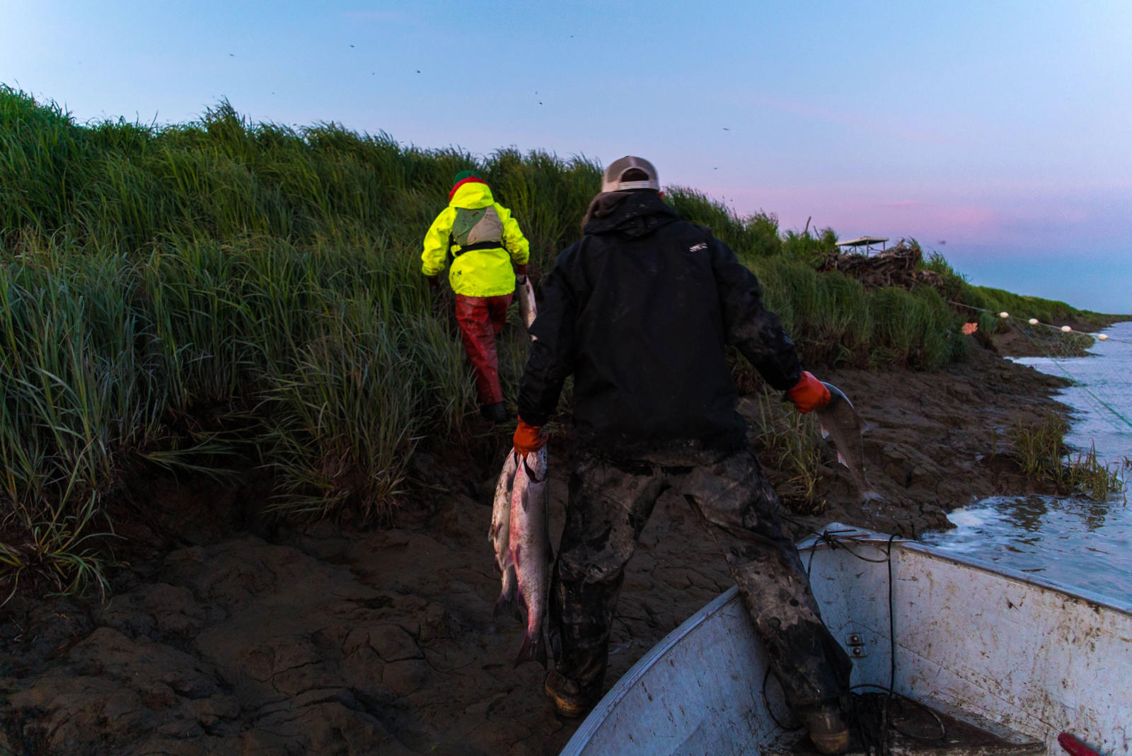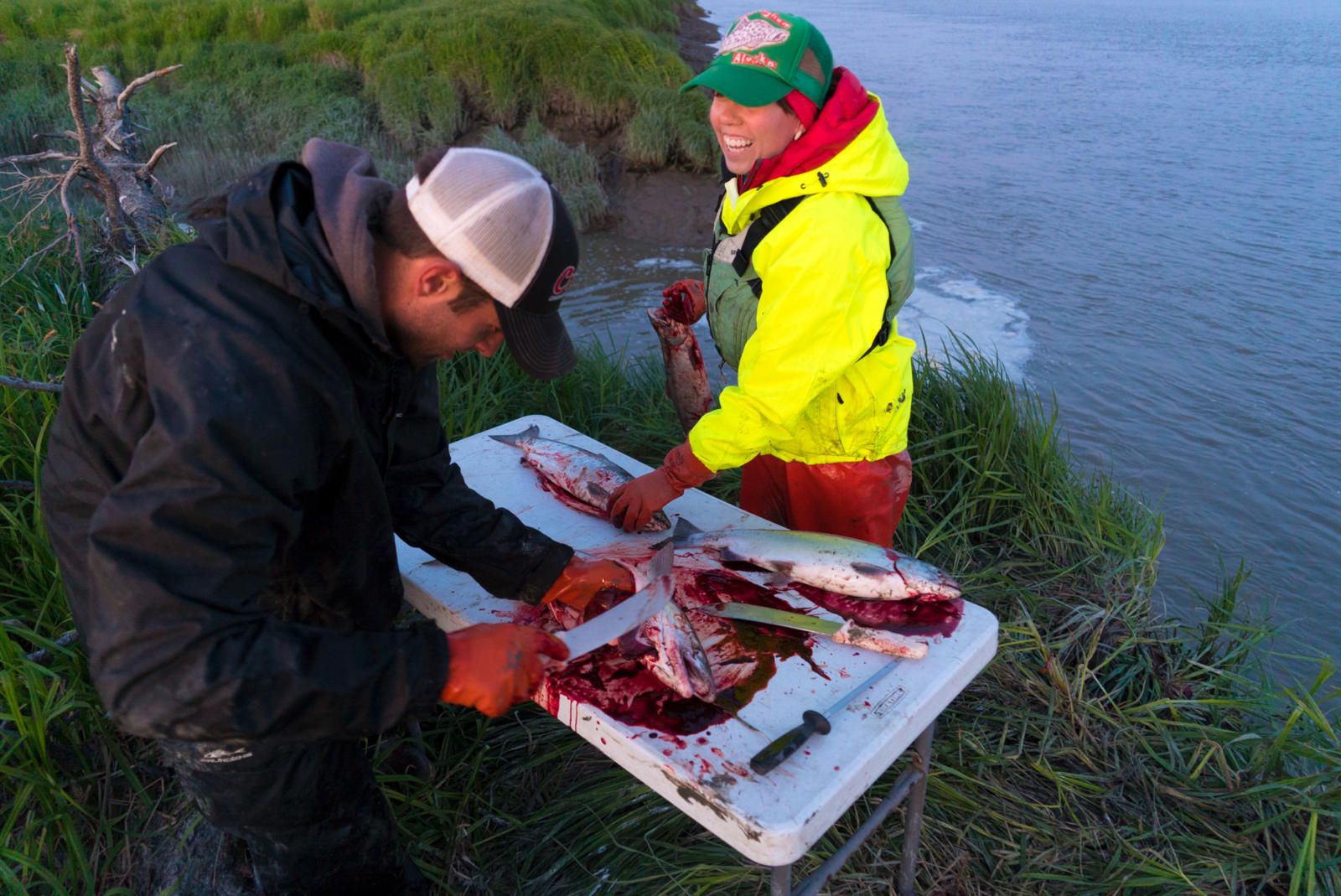 It’s 11pm under the gold-soaked sky of Dillingham’s summer solstice. Apayuq and her fishing partner, Chris Strub, are parked in the lot of the local boat ramp listening to the late night KDLG broadcast. Listeners call in to tell jokes, profess love, and send best wishes to the fishing fleet throughout Bristol Bay. Tonight, Apayuq and Chris are getting in on those good wishes. They wait for the tide to lap high enough to push their skiff off into the salmon-laden waters of the Wood River.