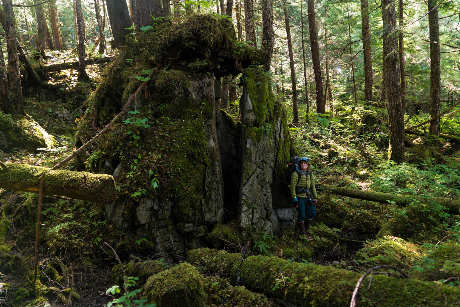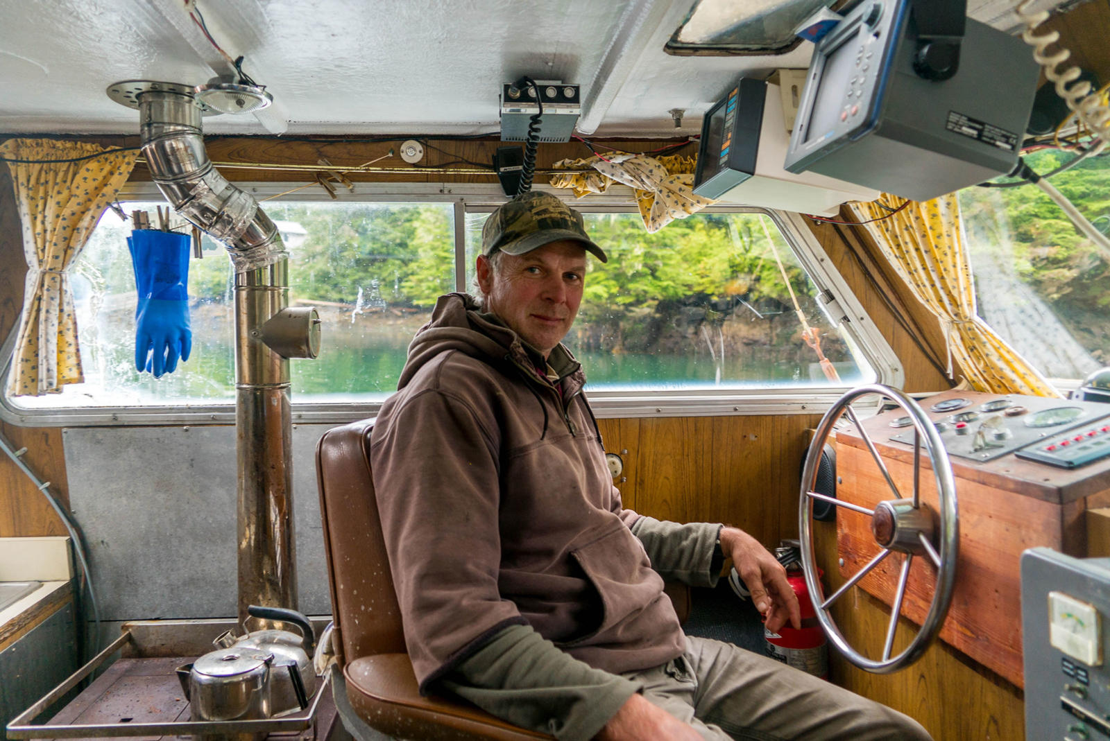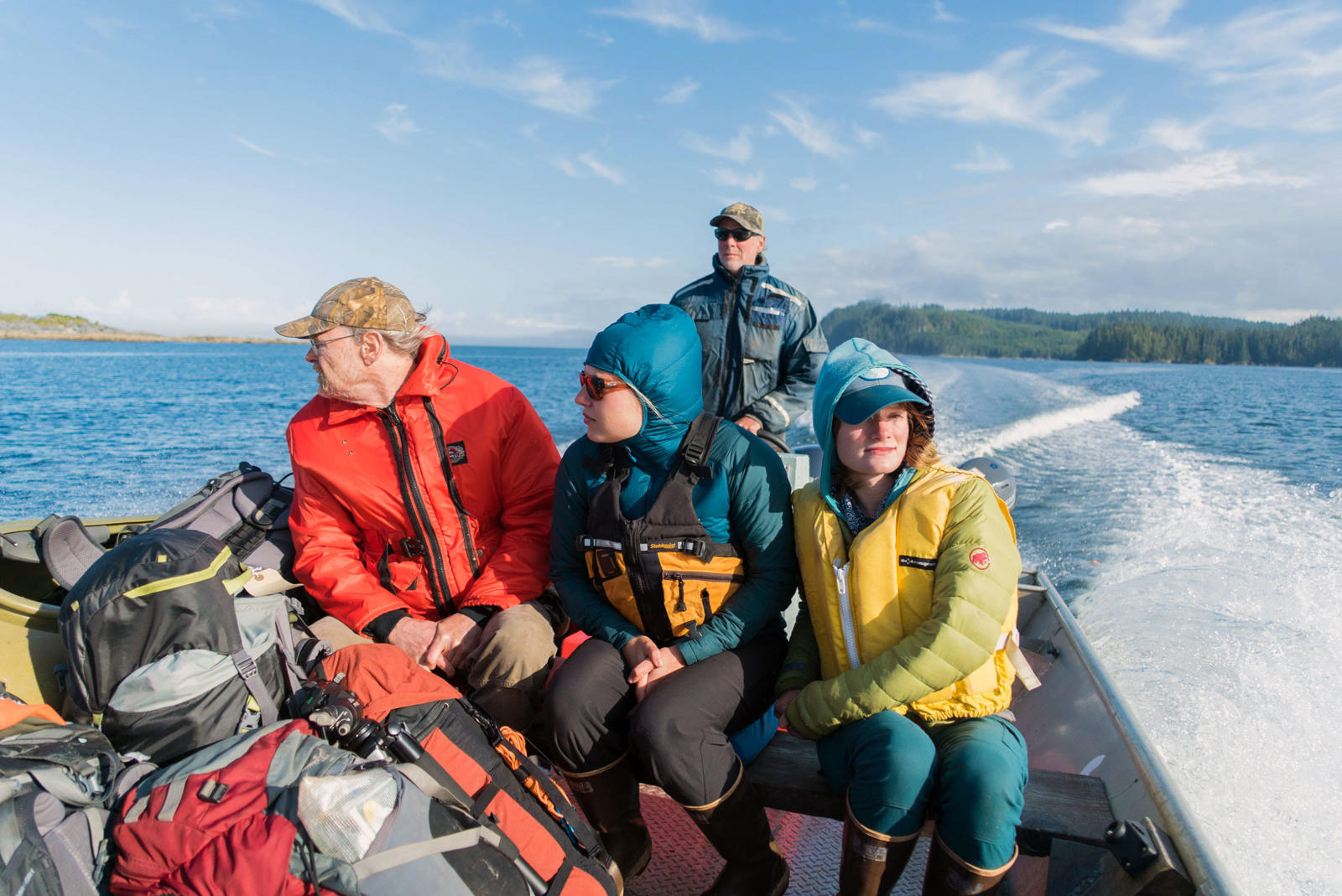 Massive limestone peaks vault from the hills beyond the bow of Don Hernandez’s skiff as he heads for the shore of Suk Dáa Bay. His friend, Elsa Sebastian, hops out and hefts her trekking pack onto the beach. In true fisherman form, she suits up, pulling her Grundens bibs over her Xtratufs before setting off with her hiking partners.