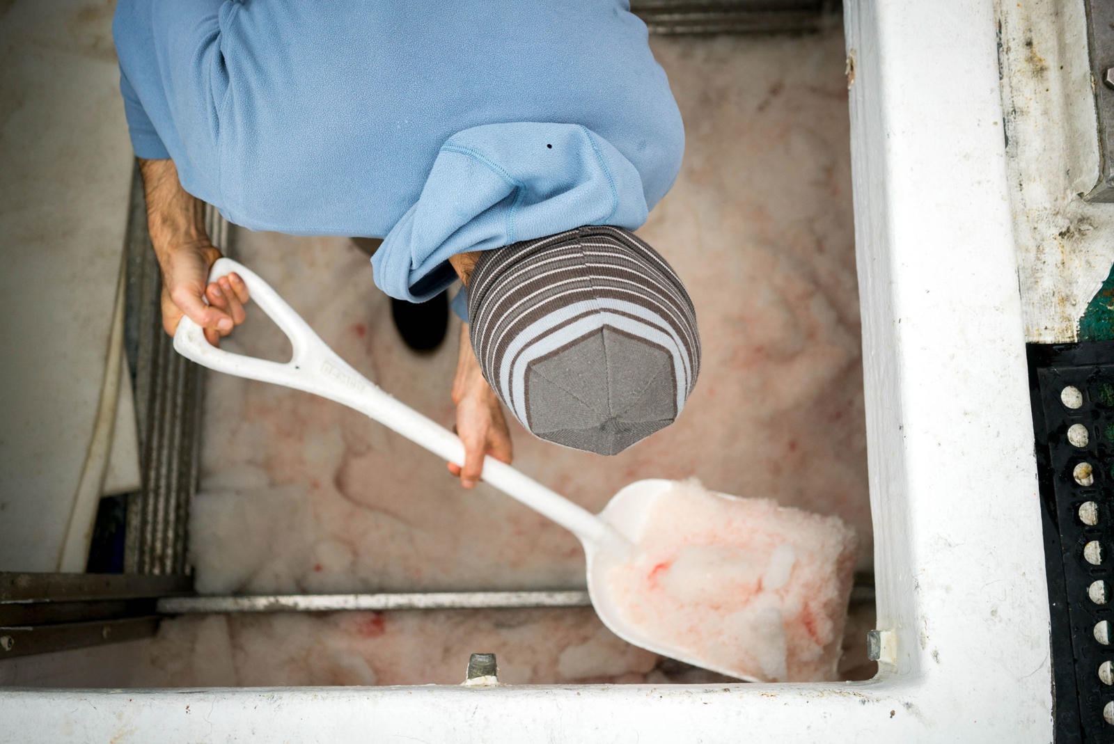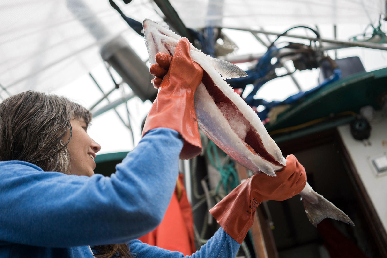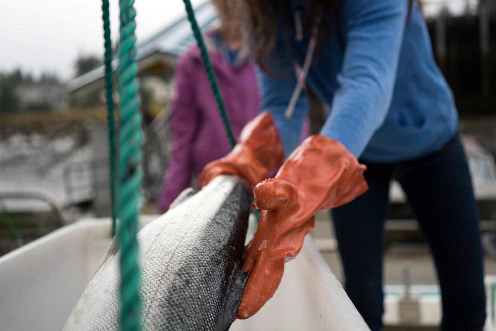To win I must lift the hooked coho from the froth of the sea, a motion that sends the fish into a powerful and frantic flexing that threatens to jump the hook from her mouth.  With the wire wrapped around a glove, and the bucking fish cutting off circulation to my hand, I must gaff the direct center of her skull. If I am successful she will stun and die immediately. But sometimes I only shock her. After bringing her over my shoulder and onto the metal tray at my waist, I find that being out of the water has only granted her more strength to fight, and fight she will. To make a living, we repeat this battle hundreds of times a day and tens of thousands of times a season. Our own muscles are shaped by the strength and passion of silvers.