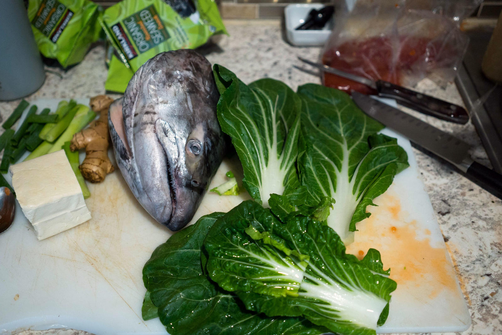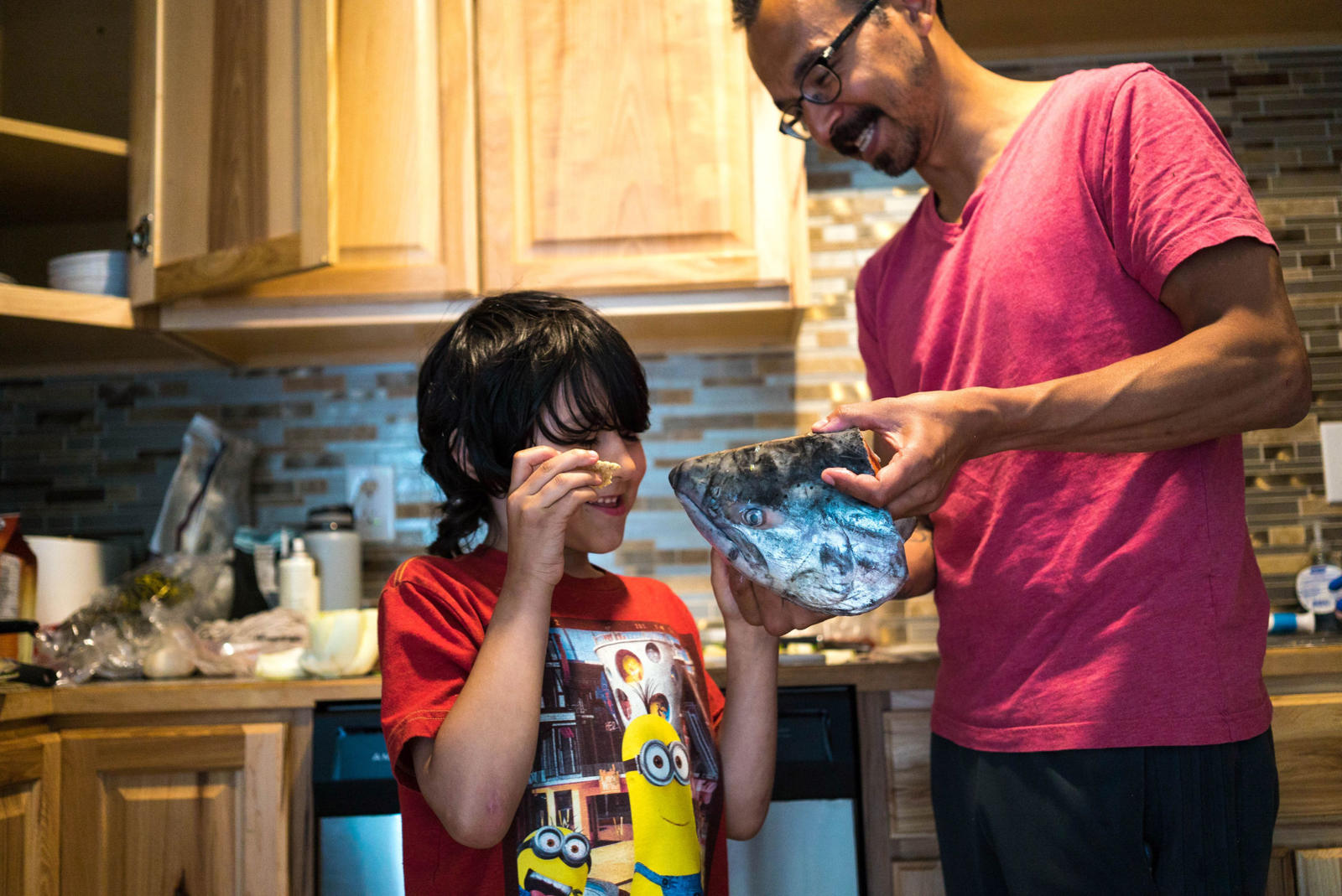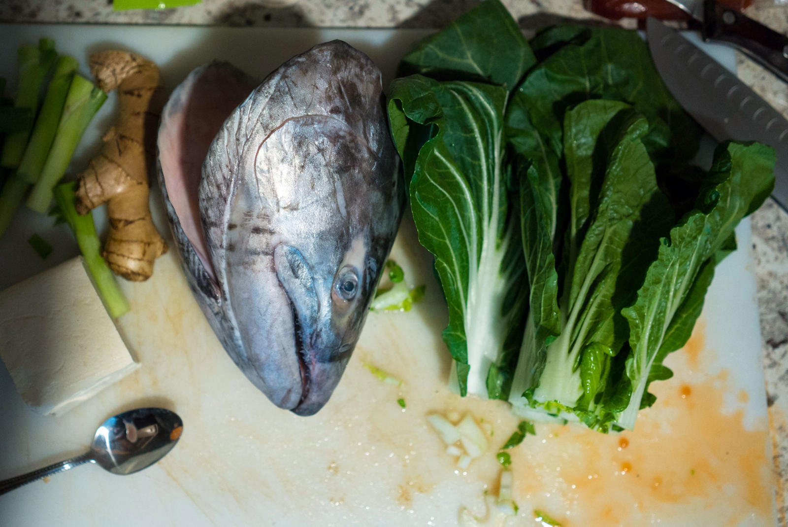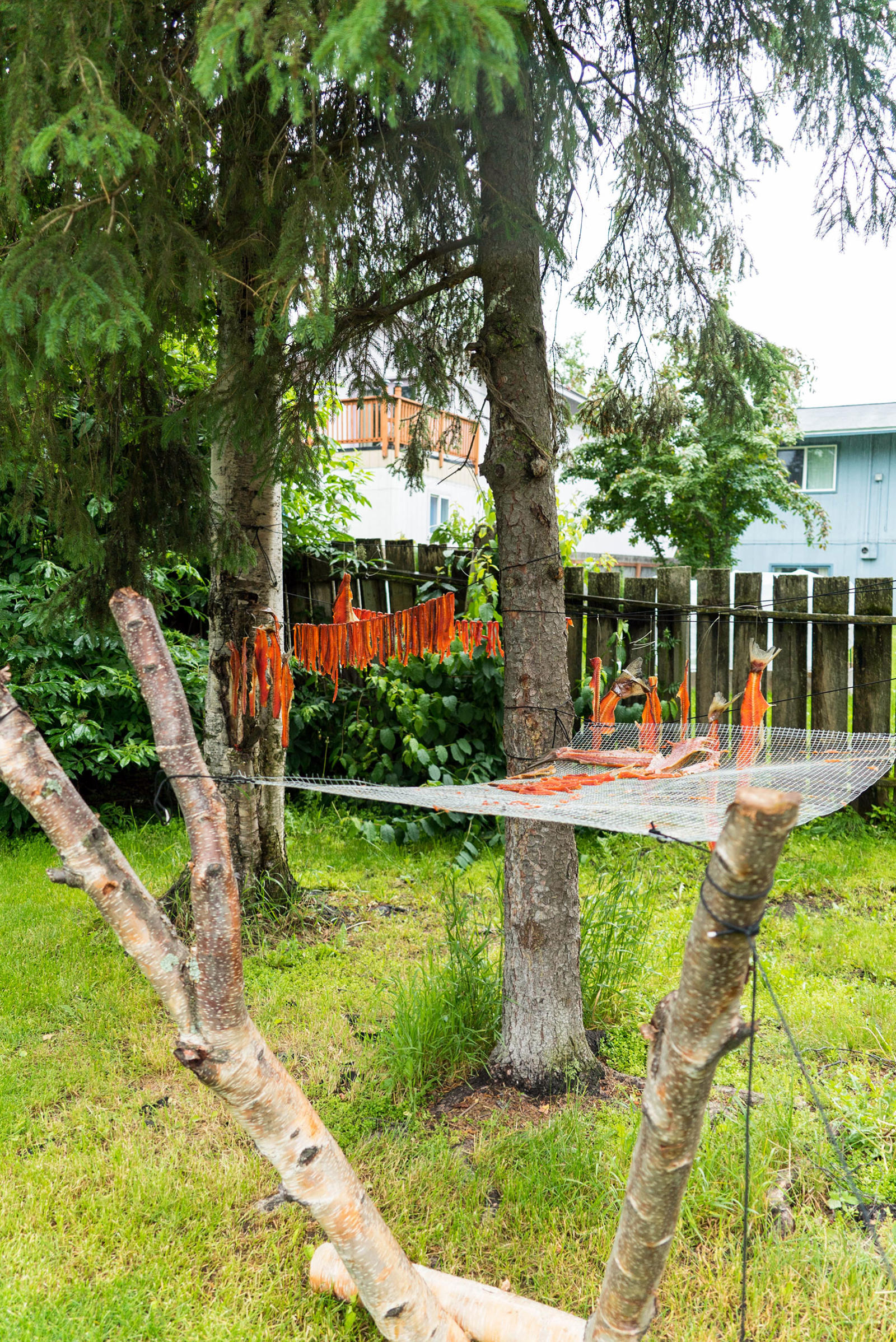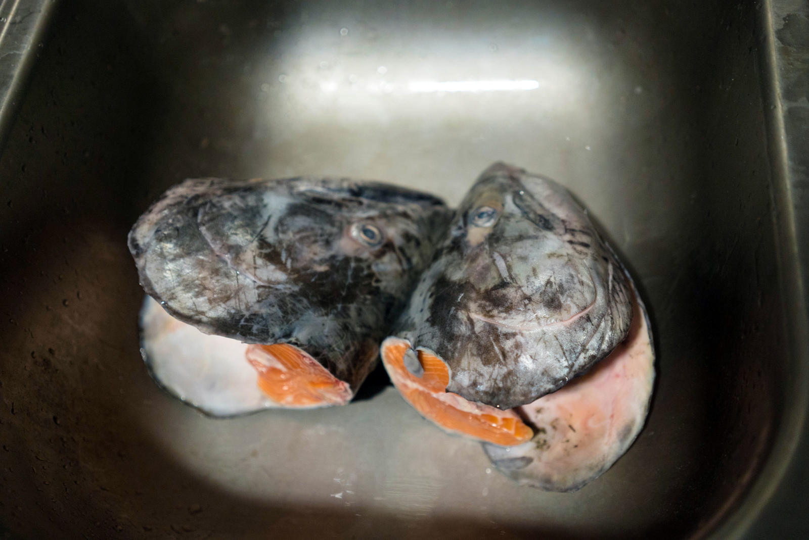 Ginger, miso, bok choy, celery, noodles, seaweed, tofu, and salmon eggs surround the two fresh king salmon heads that stain his white cutting board light orange. Warren chops and dices in his kitchen while his two older kids scurry in and out of the house. His baby crawls happily around the living room; his middle child pops in briefly to jokingly feed crackers to the fish heads. Warren and his wife live in a blue house that sits on the edge of a suburb in southwest Anchorage. Through the woods, at the end of the street, Campbell Creek feeds into Turnagain Arm keeping Warren’s relation to the sea and the fish it provides close by.