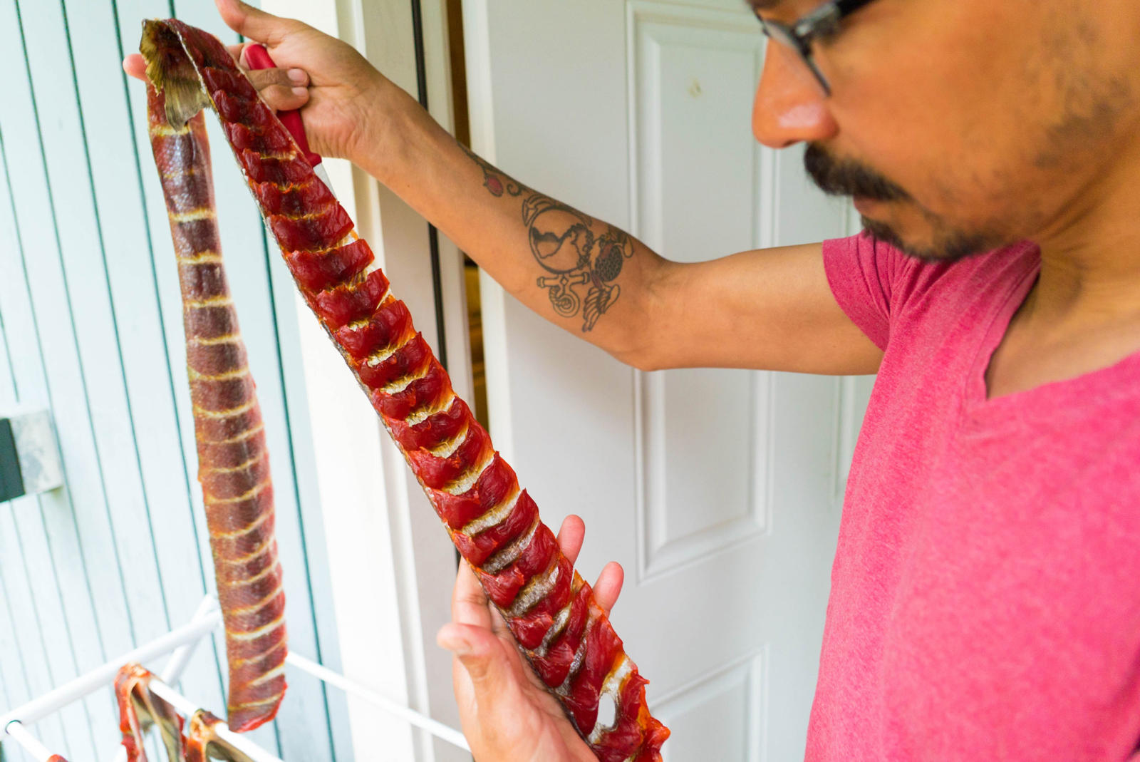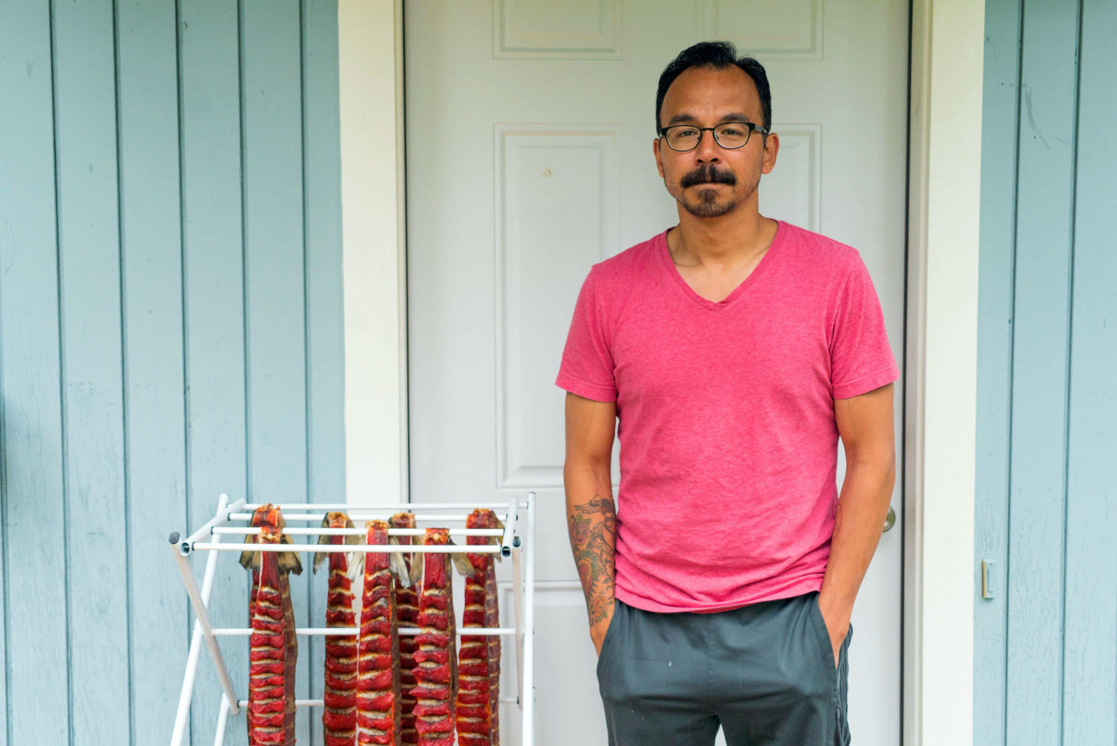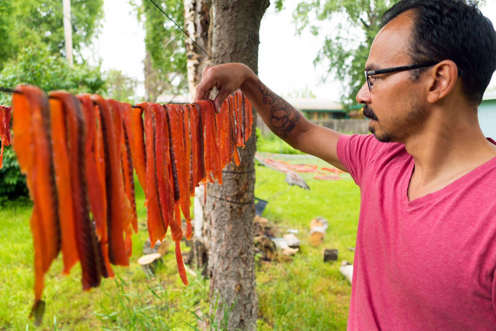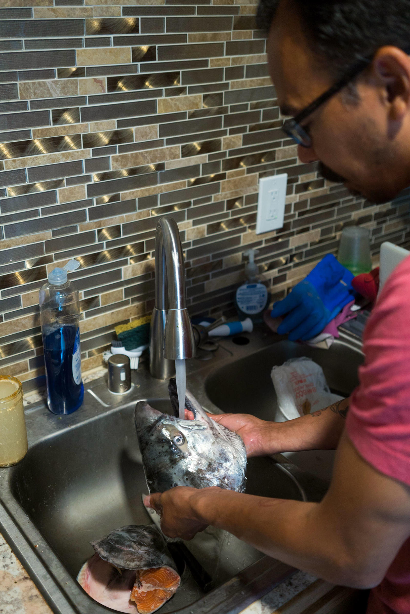 Ginger, miso, bok choy, celery, noodles, seaweed, tofu, and salmon eggs surround the two fresh king salmon heads that stain his white cutting board light orange. Warren chops and dices in his kitchen while his two older kids scurry in and out of the house. His baby crawls happily around the living room; his middle child pops in briefly to jokingly feed crackers to the fish heads. Warren and his wife live in a blue house that sits on the edge of a suburb in southwest Anchorage. Through the woods, at the end of the street, Campbell Creek feeds into Turnagain Arm keeping Warren’s relation to the sea and the fish it provides close by.