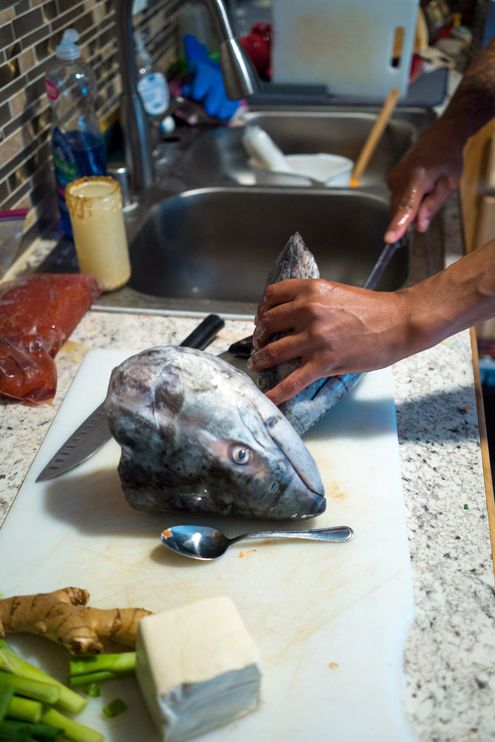 Warren Jones carefully lays out the ingredients for his family’s fish head soup, a recipe he’s adapted and changed throughout his life.